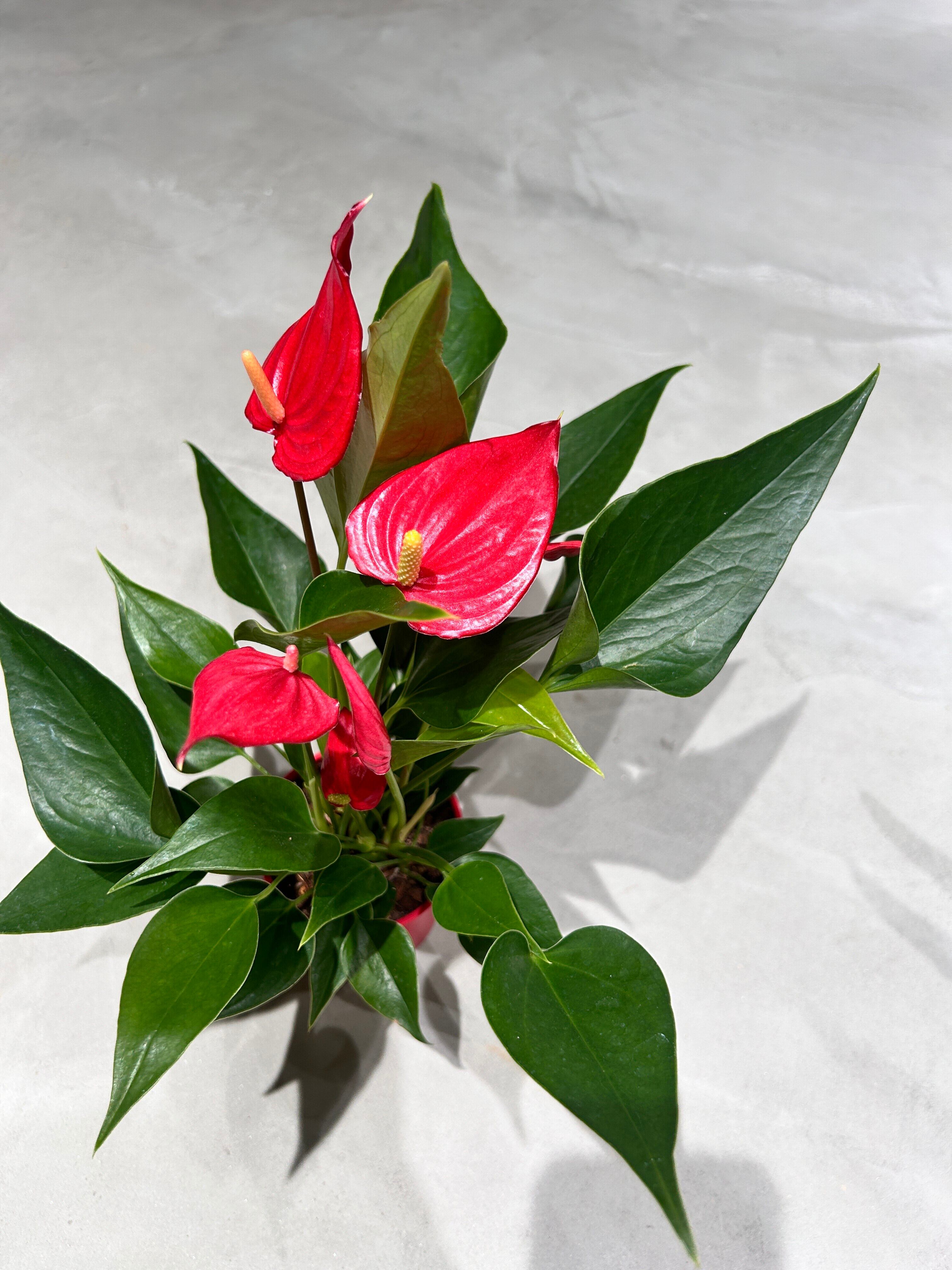 鮮やかな赤色の仏炎苞(ぶつえんほう)と光沢のある葉が特徴。