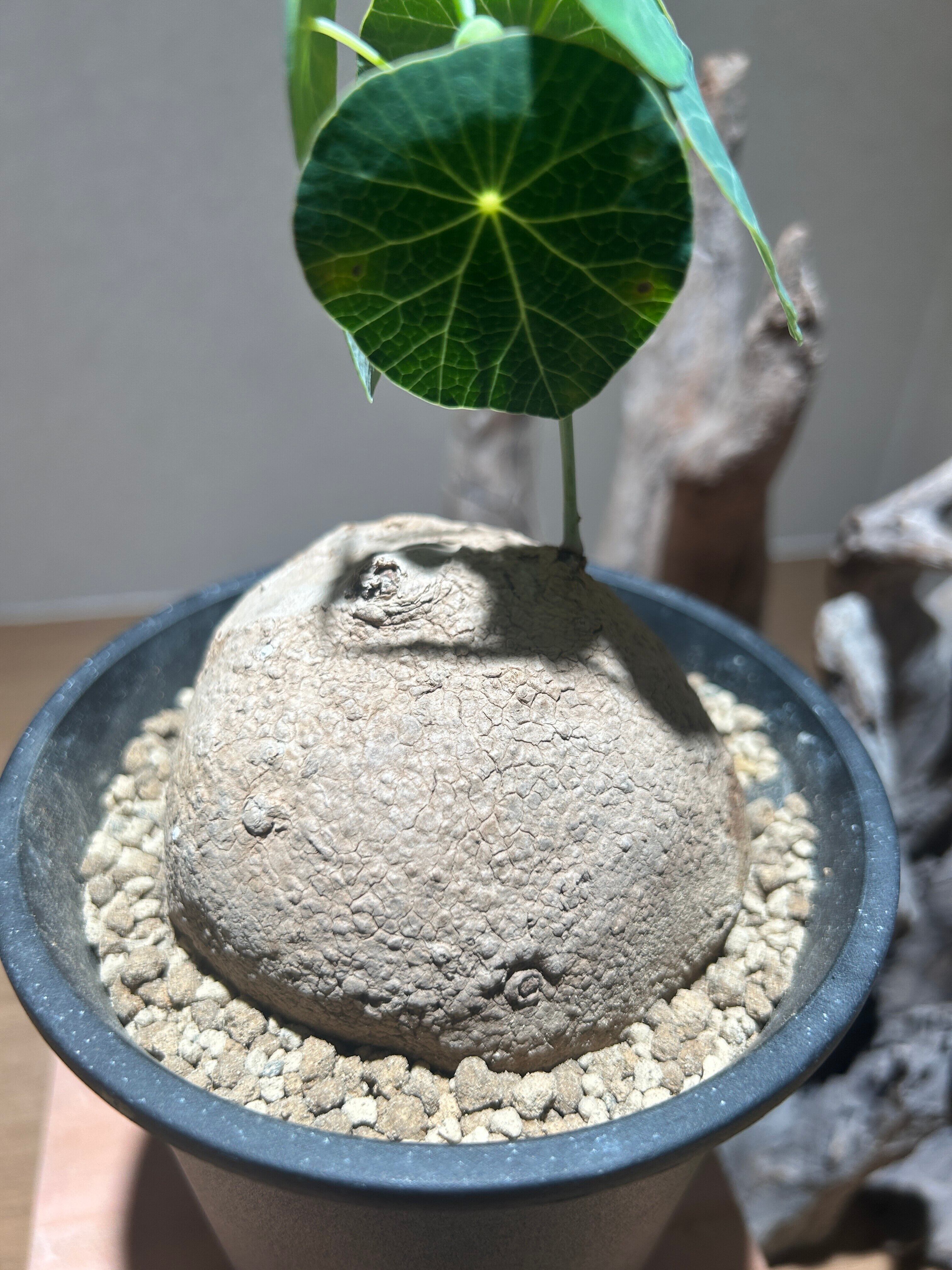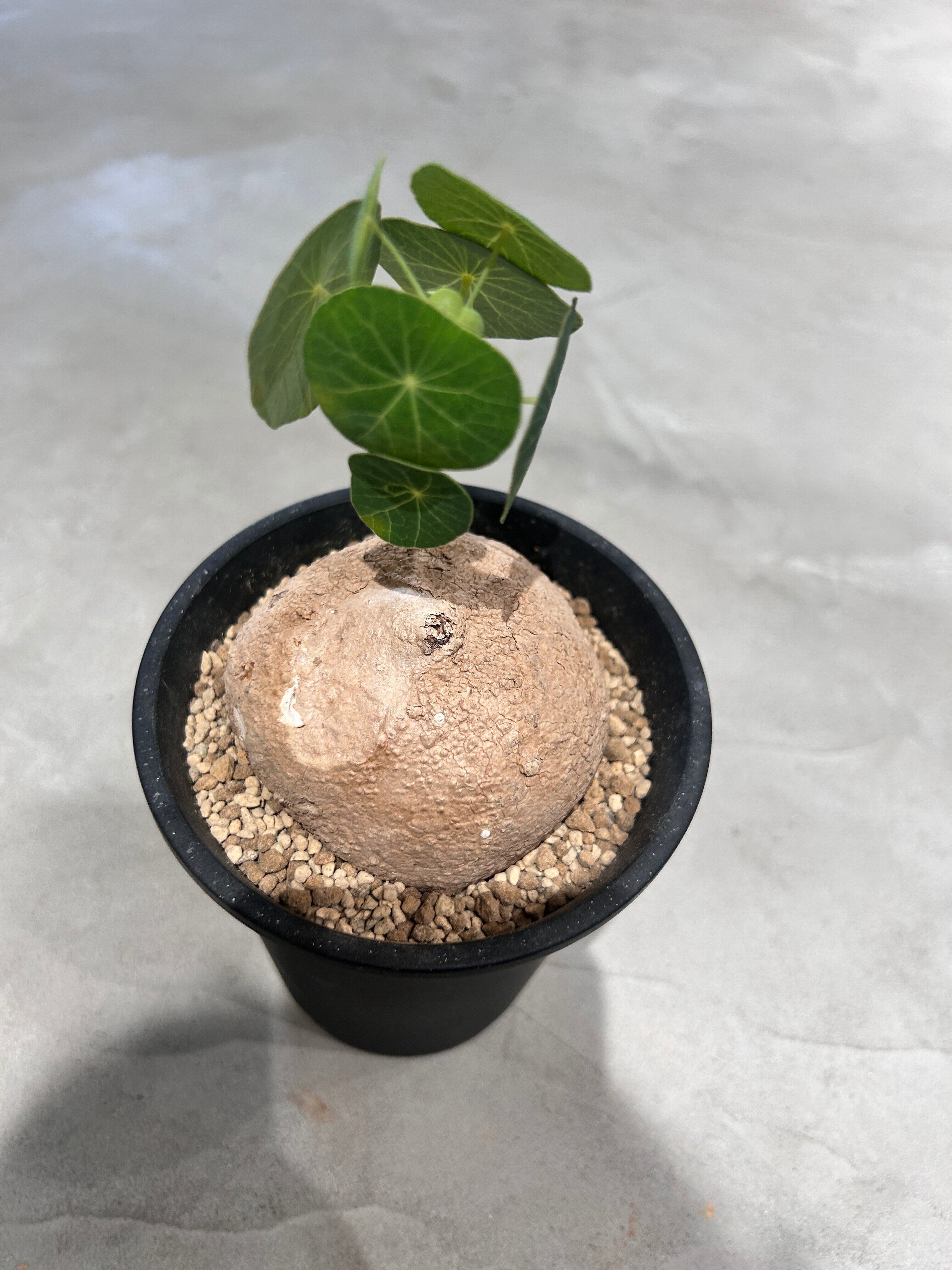 巨大な球体状の塊根に、丸く薄い繊細な葉が特徴的です。