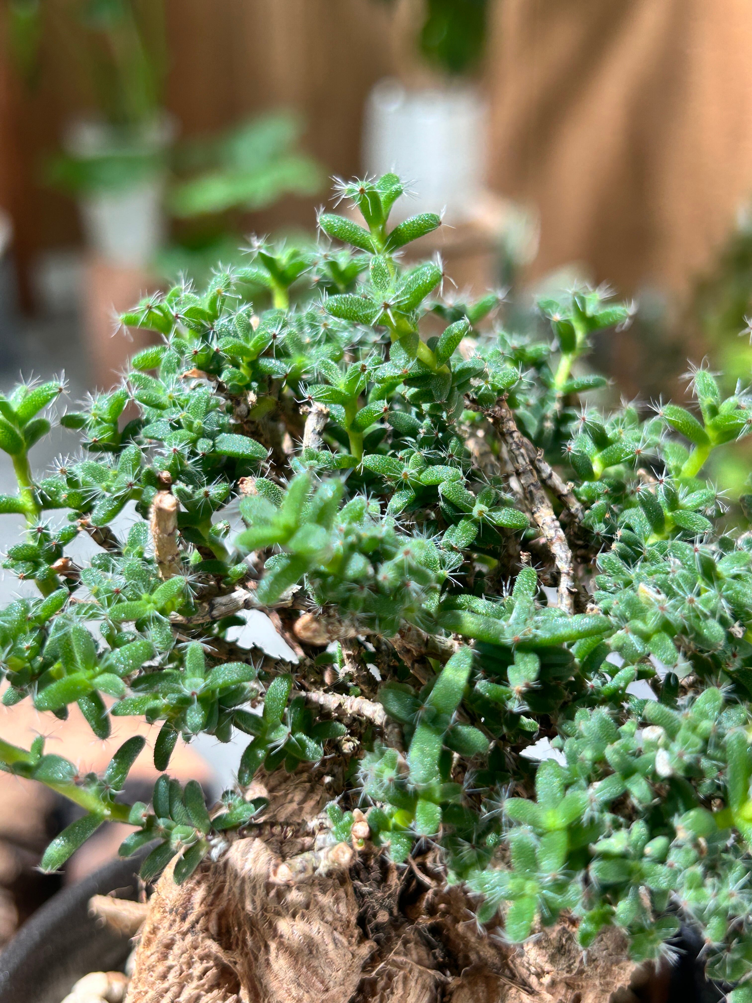 多肉質で小さい葉をつけその先端には白く細い毛を放射状につけるのが特徴です。