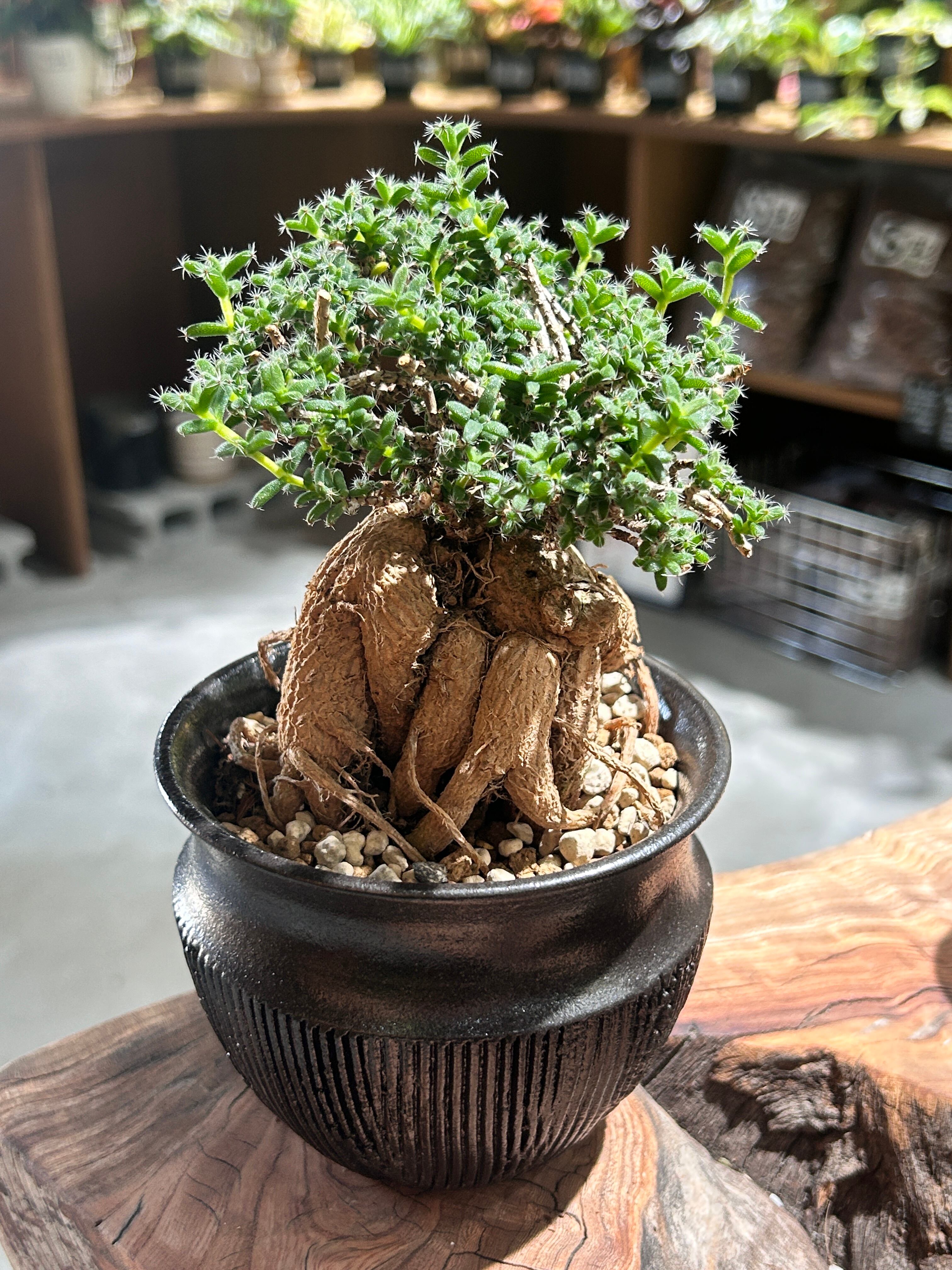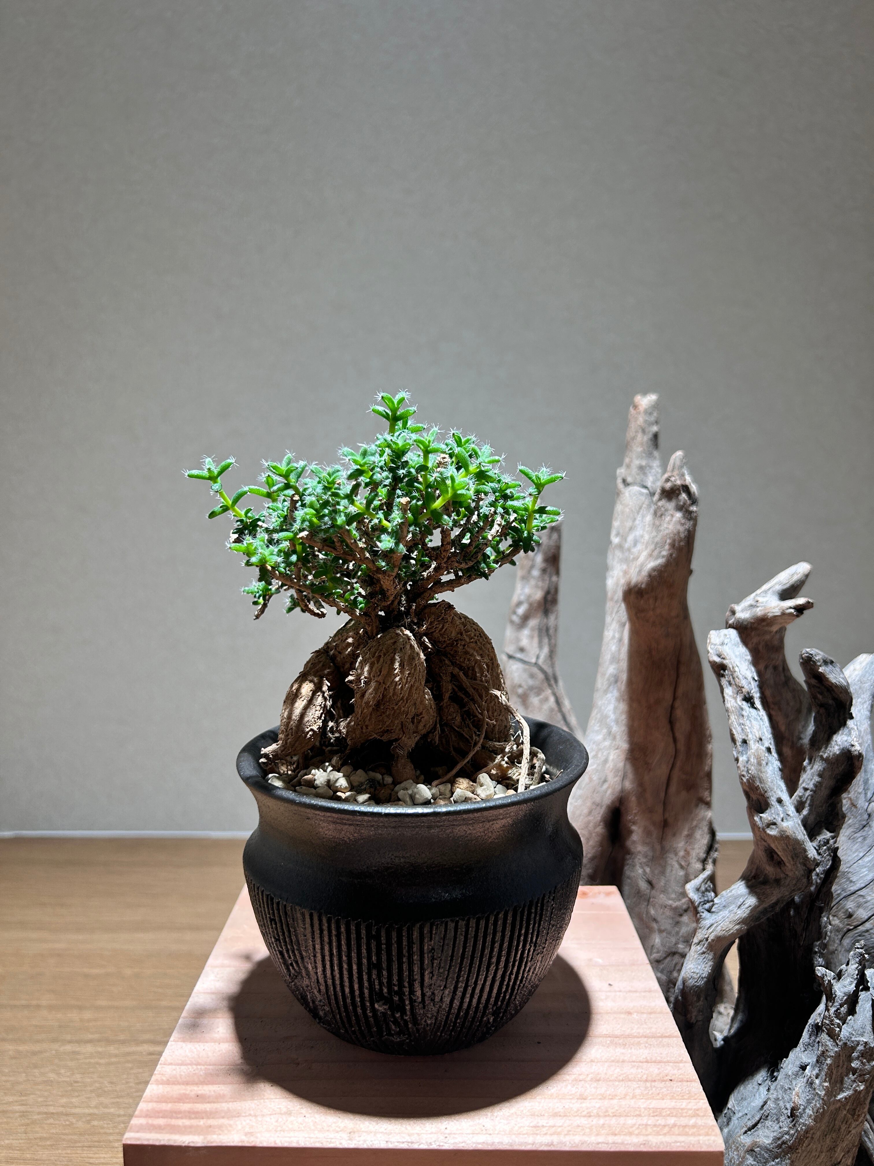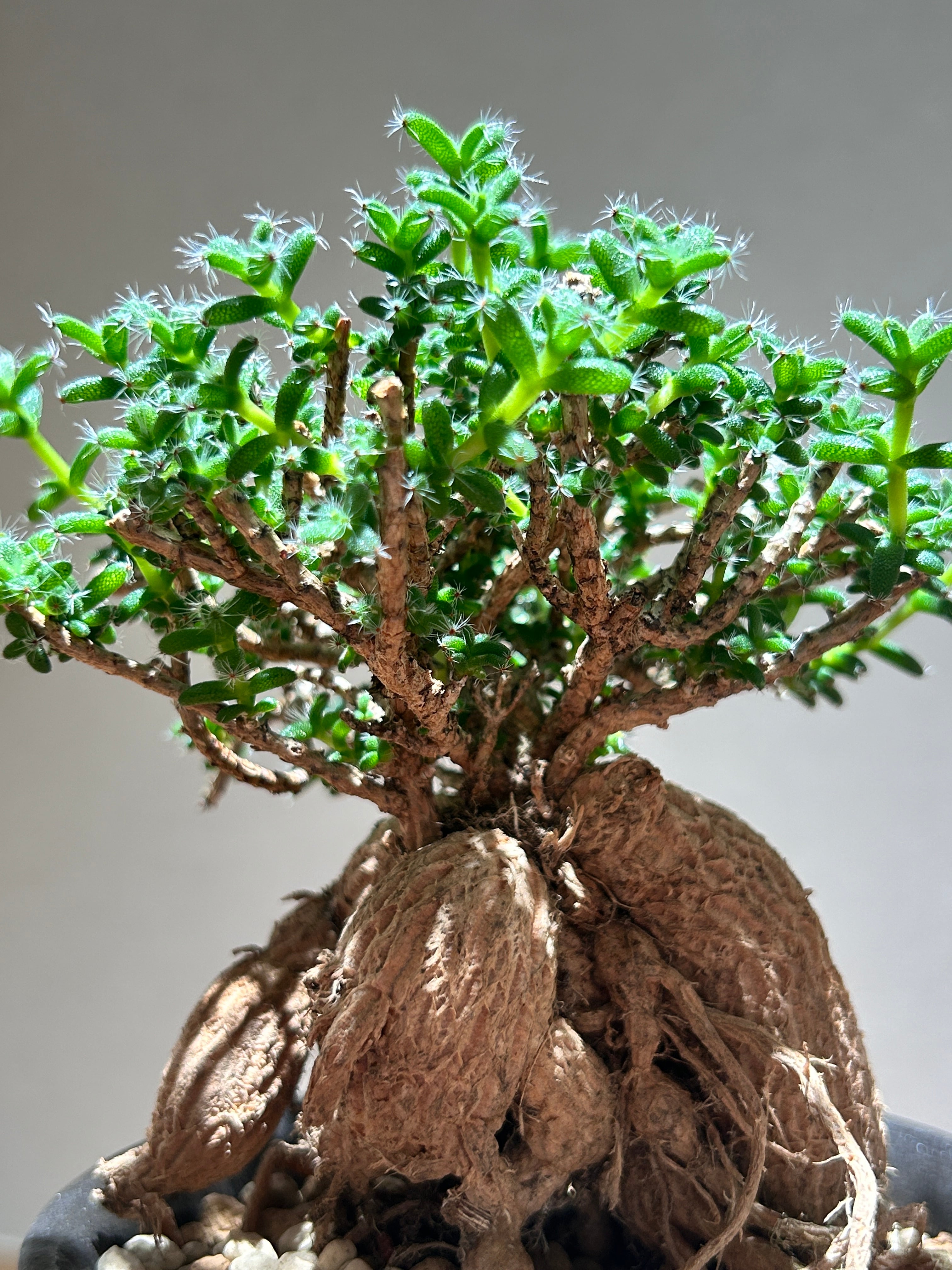 塊根部分は成長と共に肥大化し、開花時期には小さなピンク色の花を咲かせます。