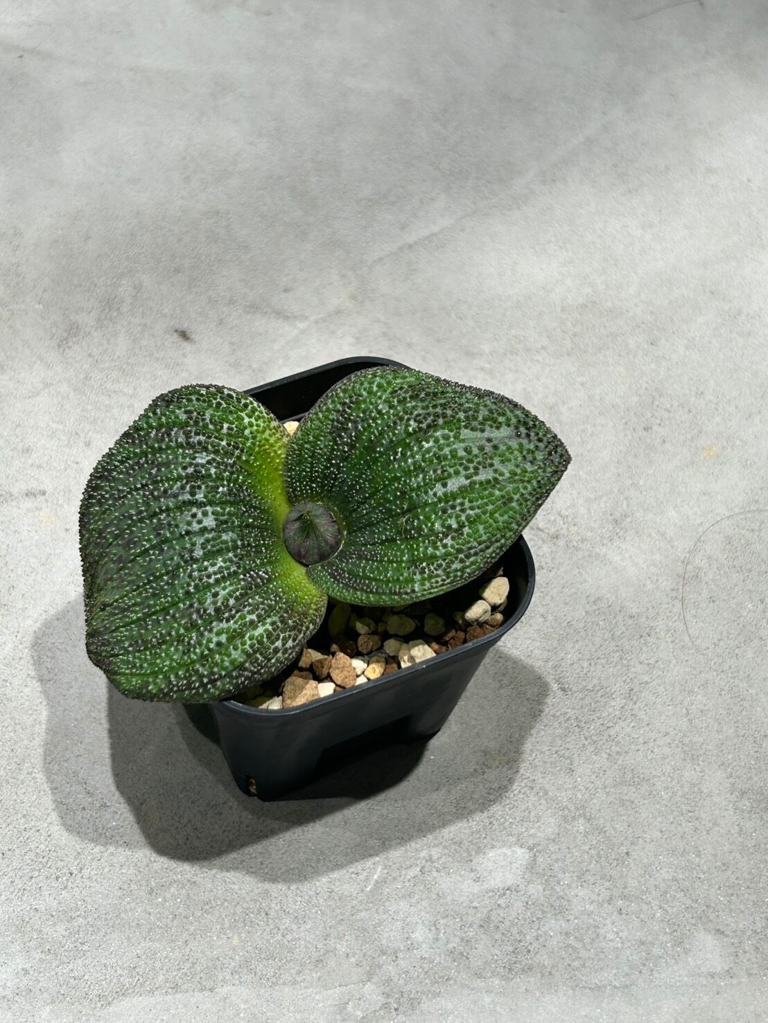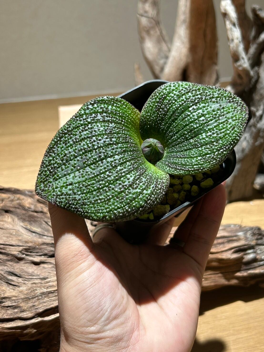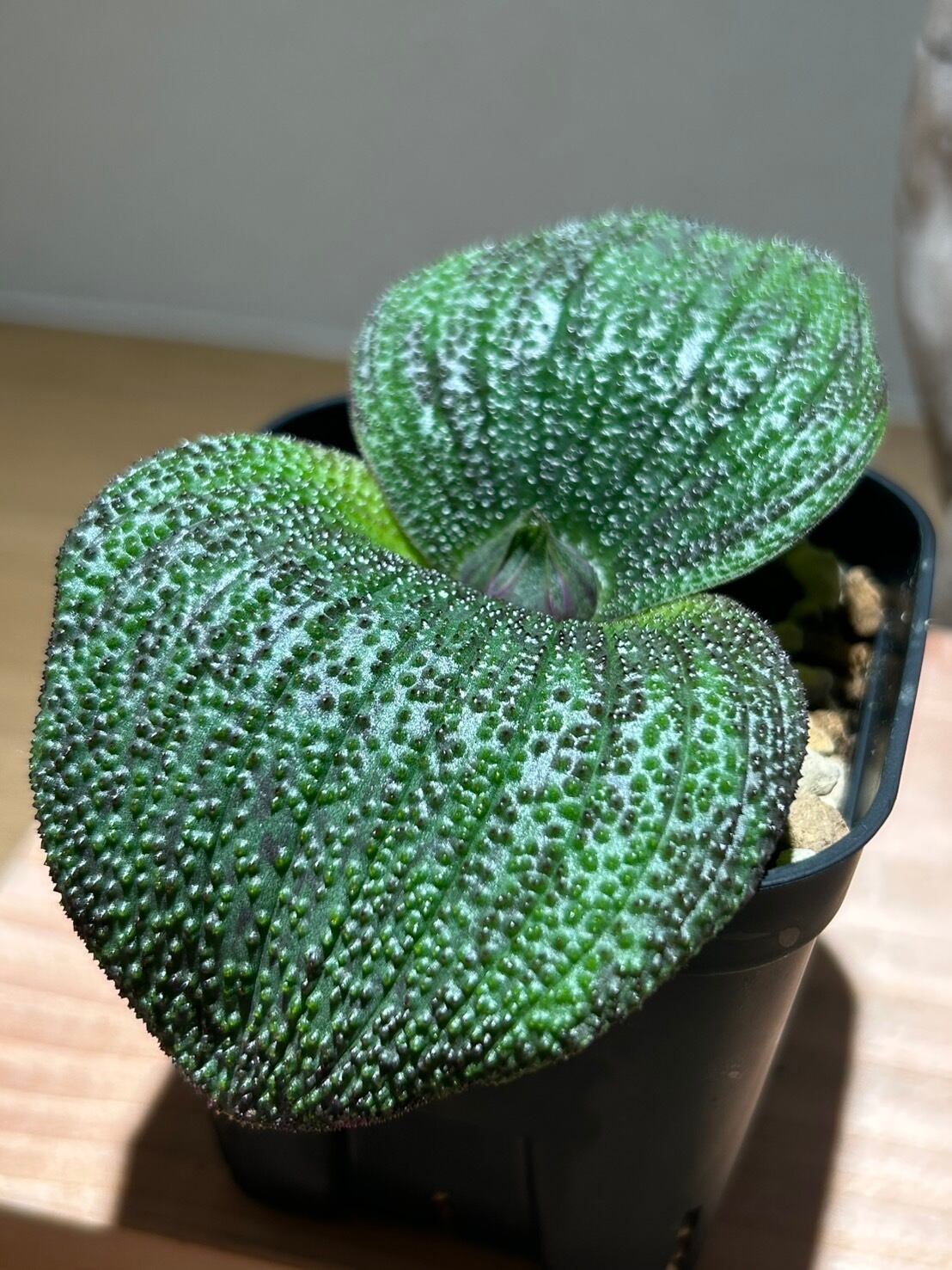秋には肉厚な葉を二枚展開し、冬には真ん中に白い花を咲かせます。