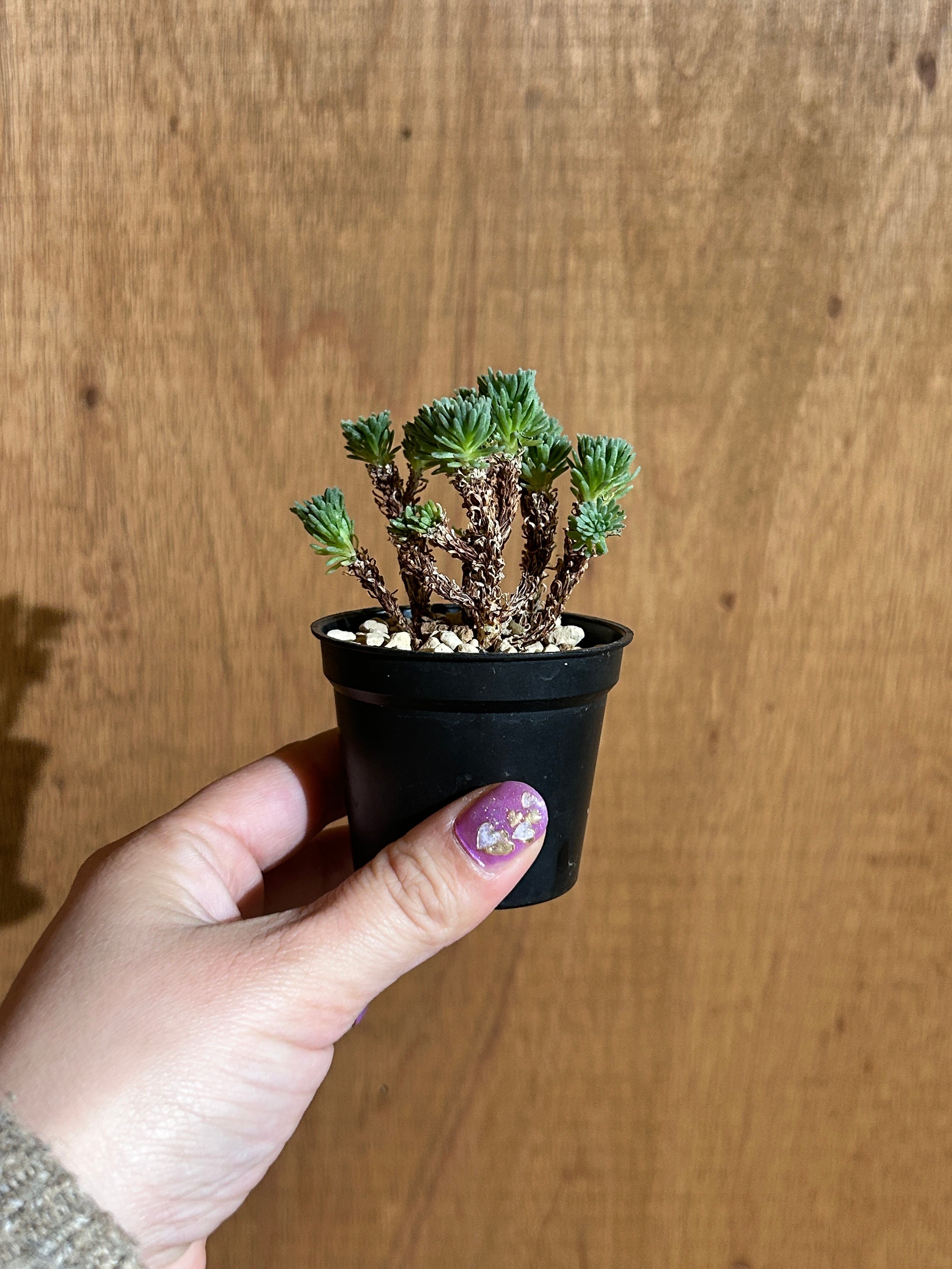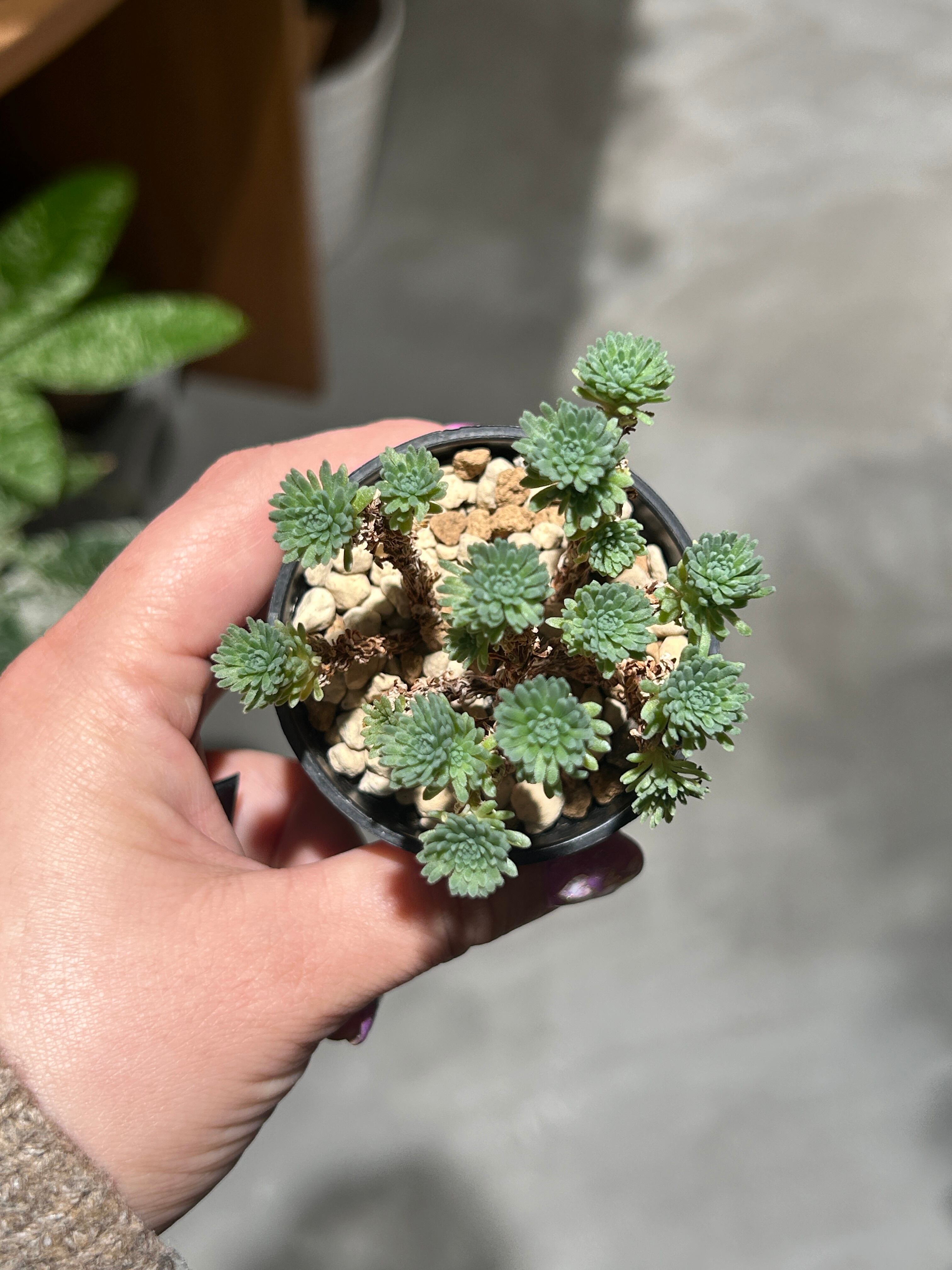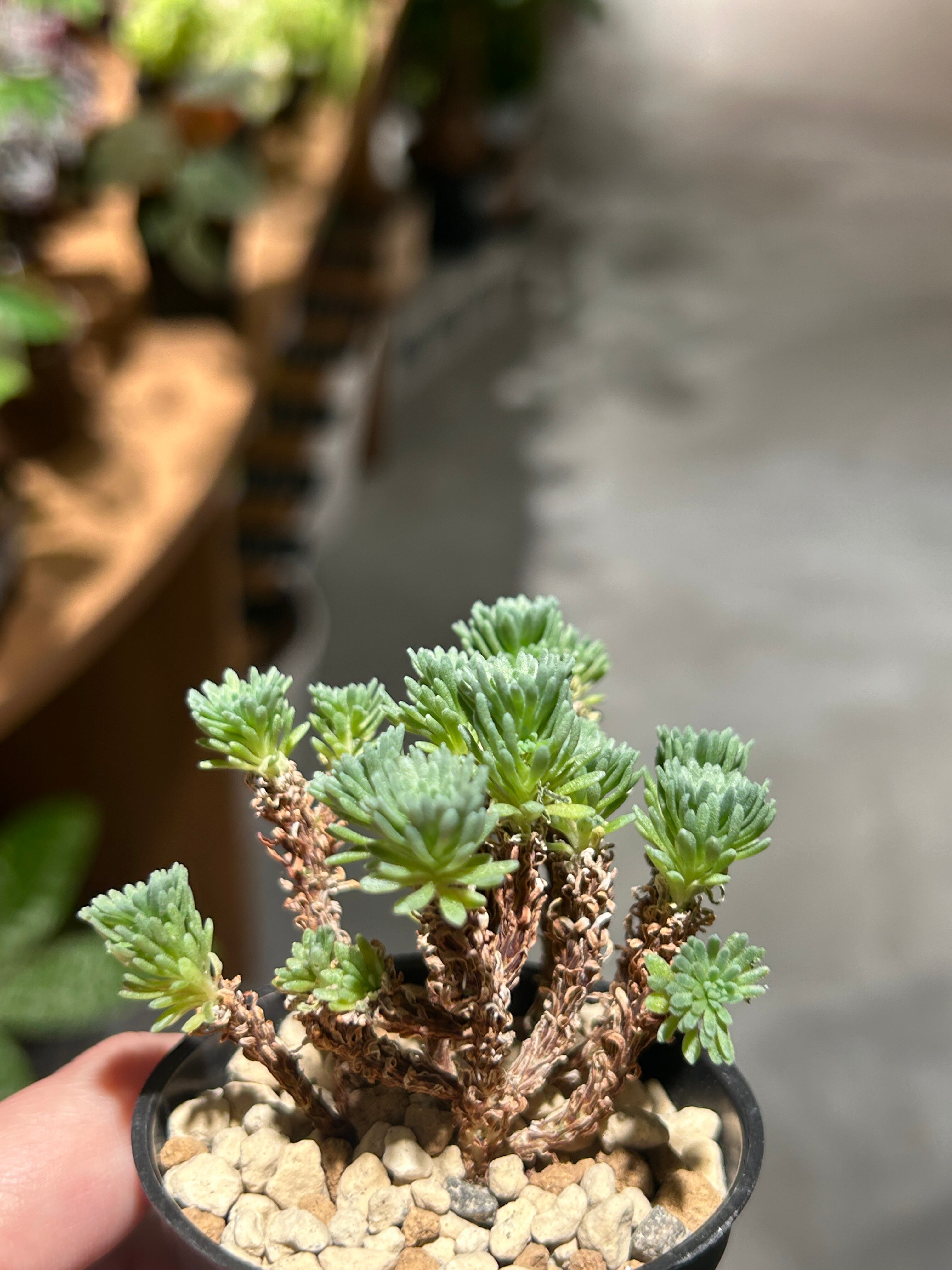 小さな葉が密に集まり、小松のような形状をしており、愛らしい見た目が特徴的です。