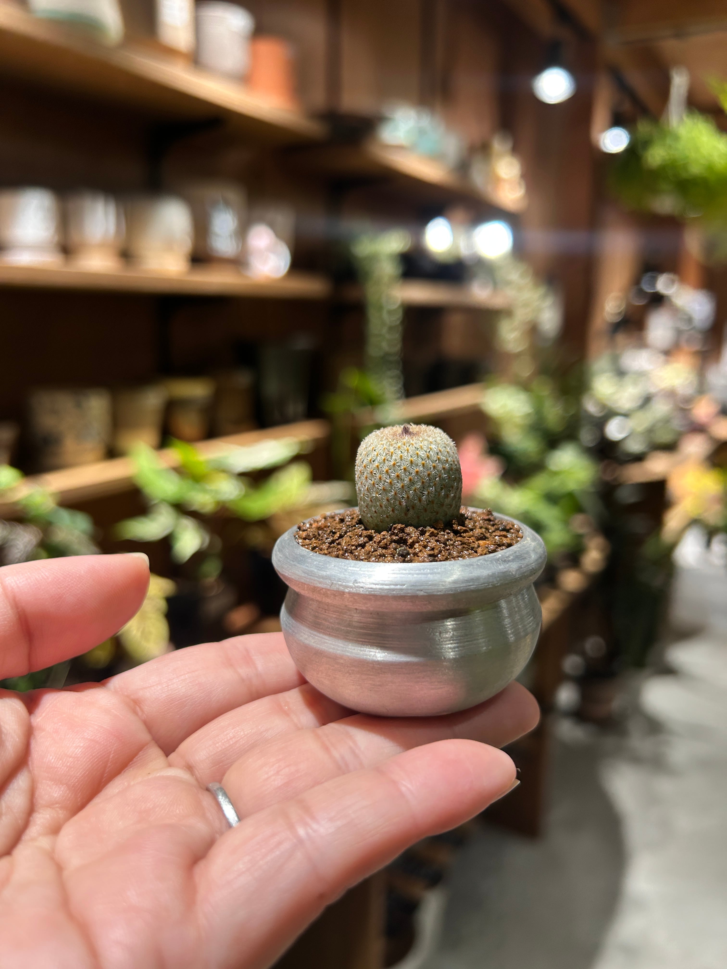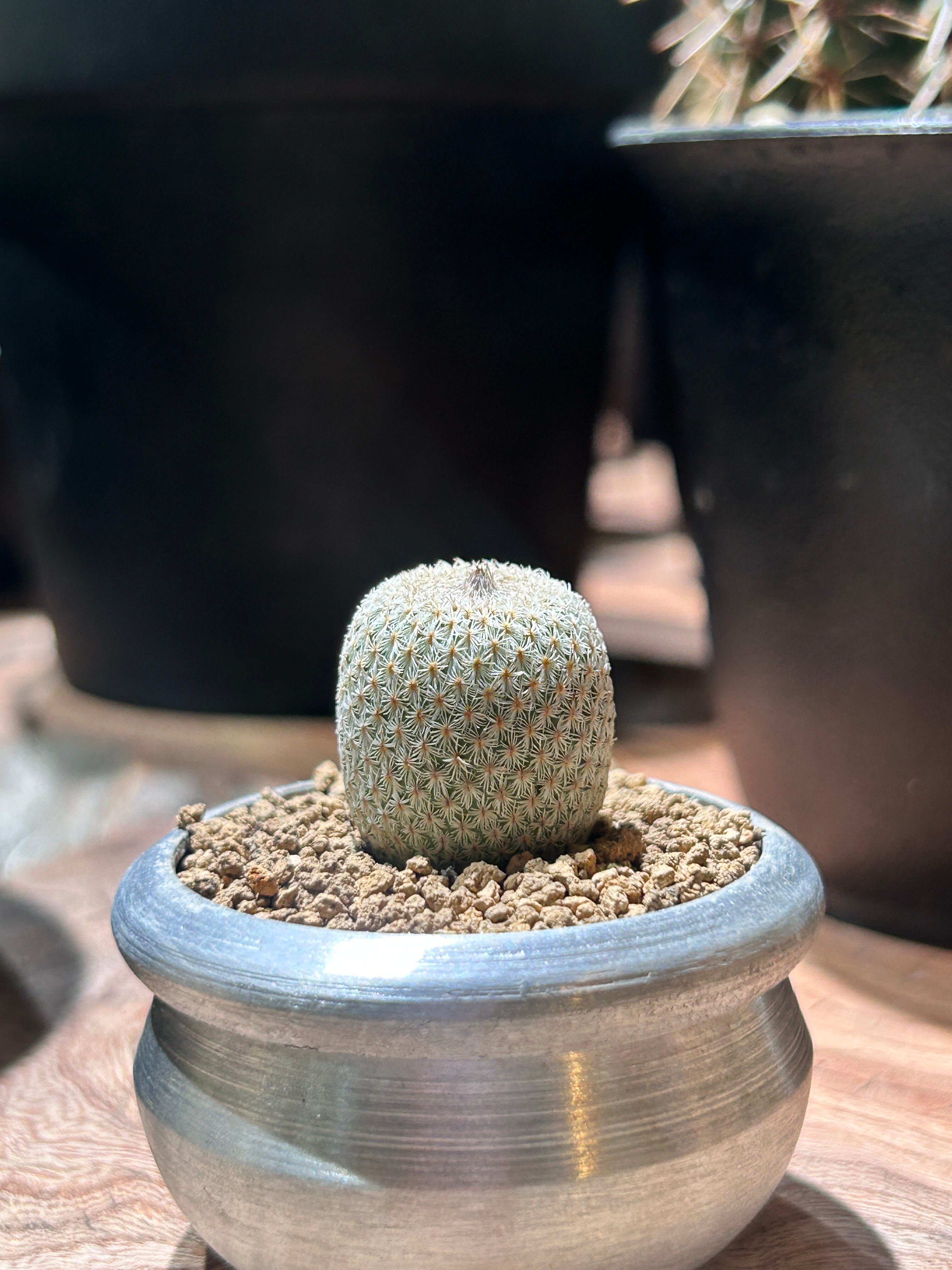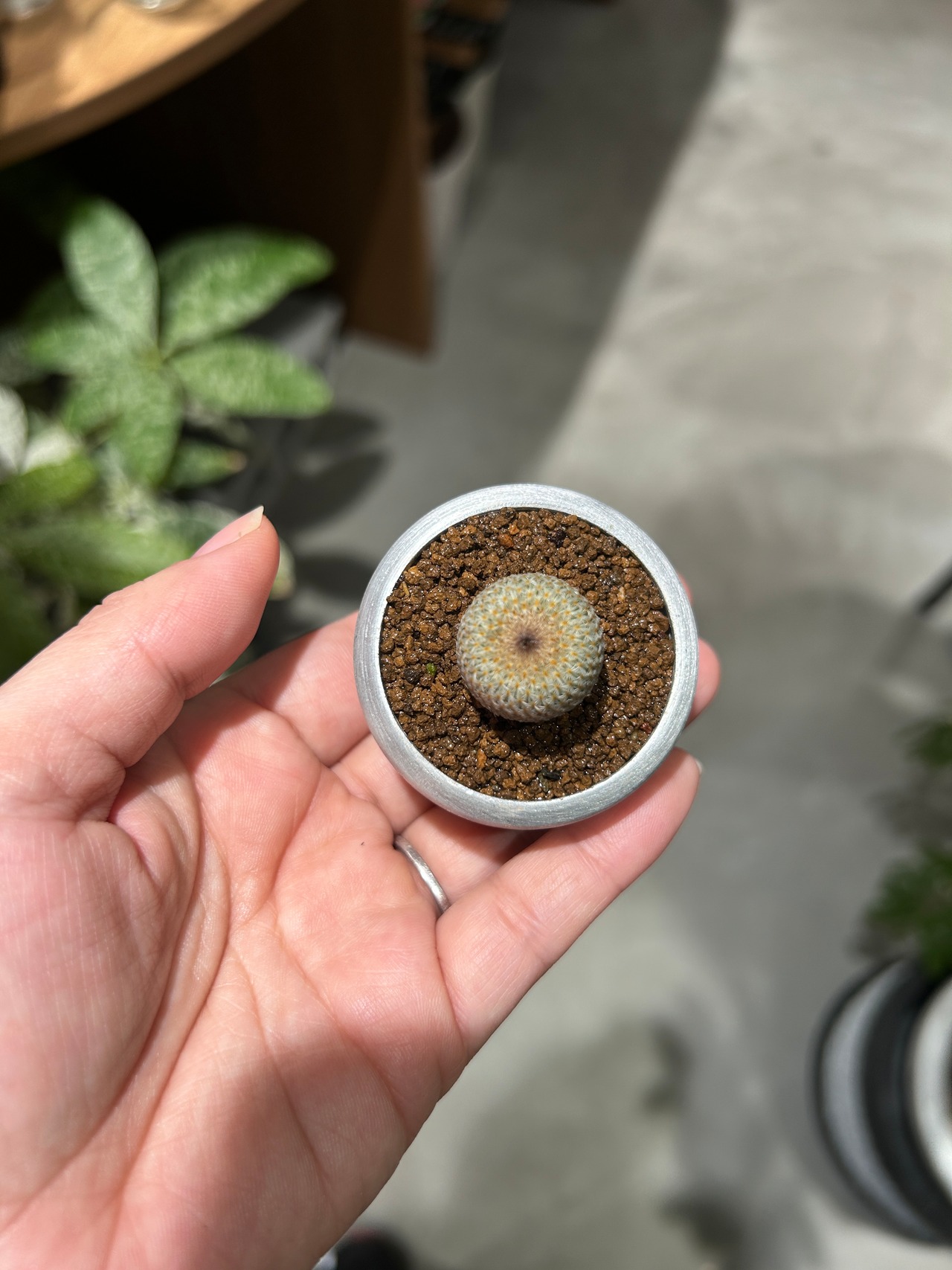 白く繊細な刺が株全体を覆い、月面のような幻想的な姿が印象的な小型サボテンです。
