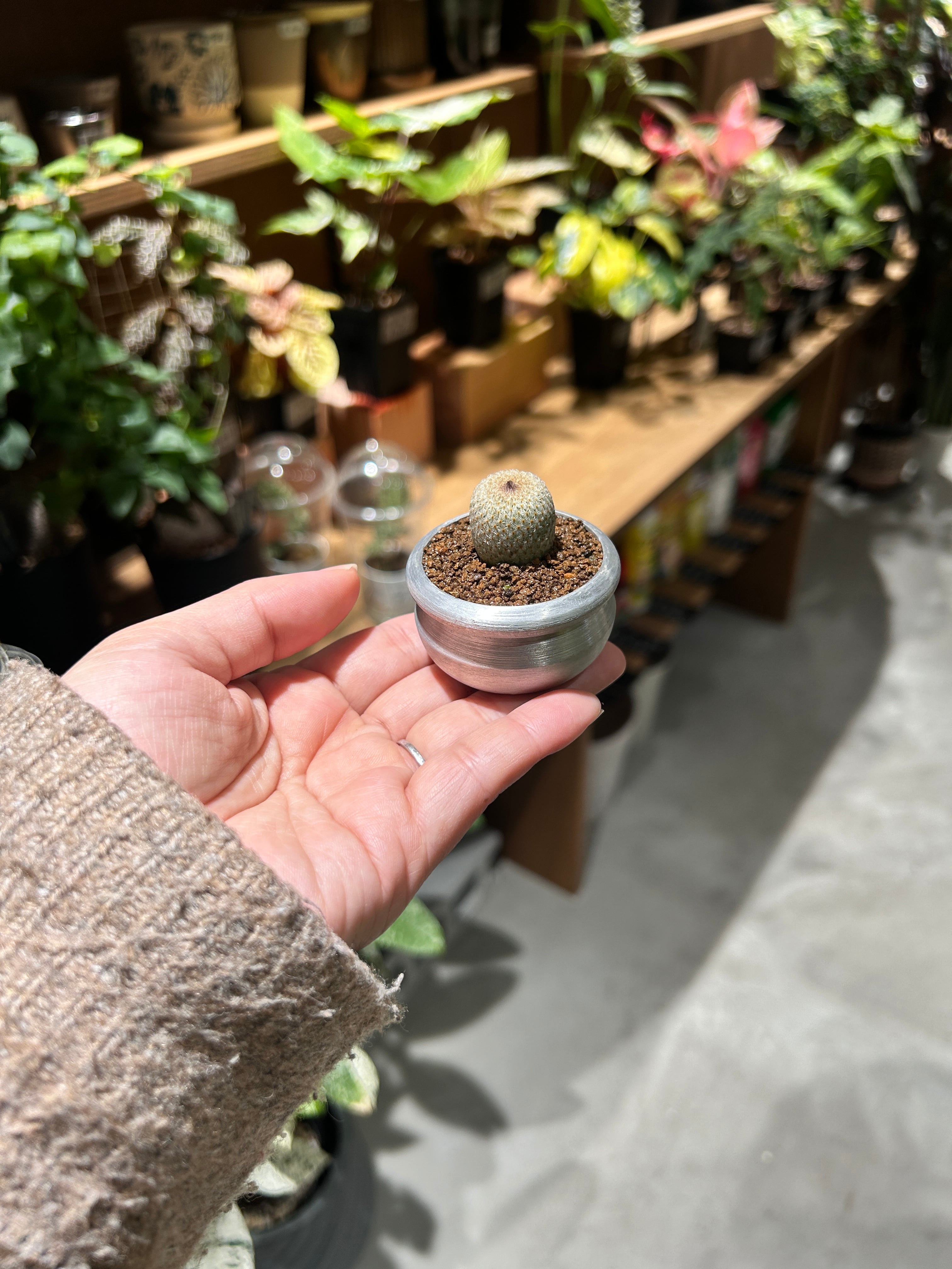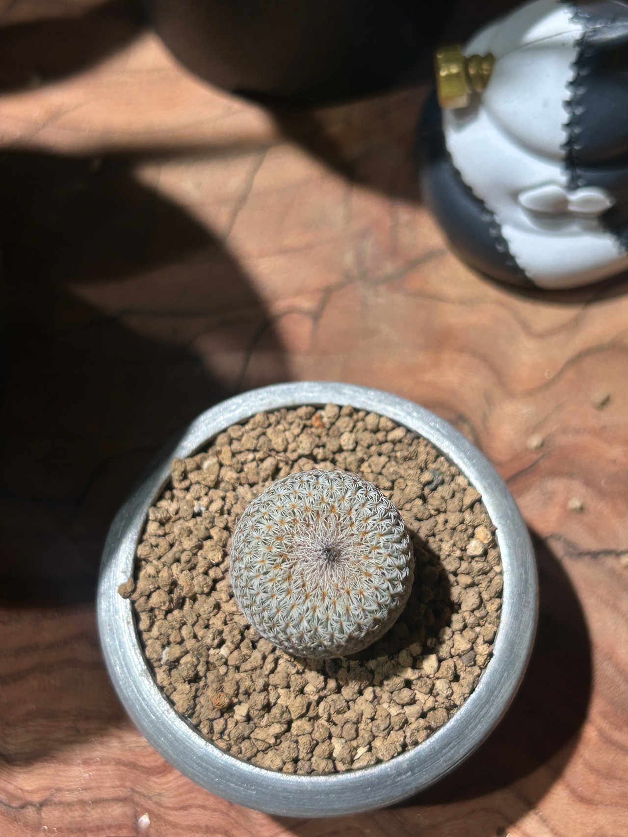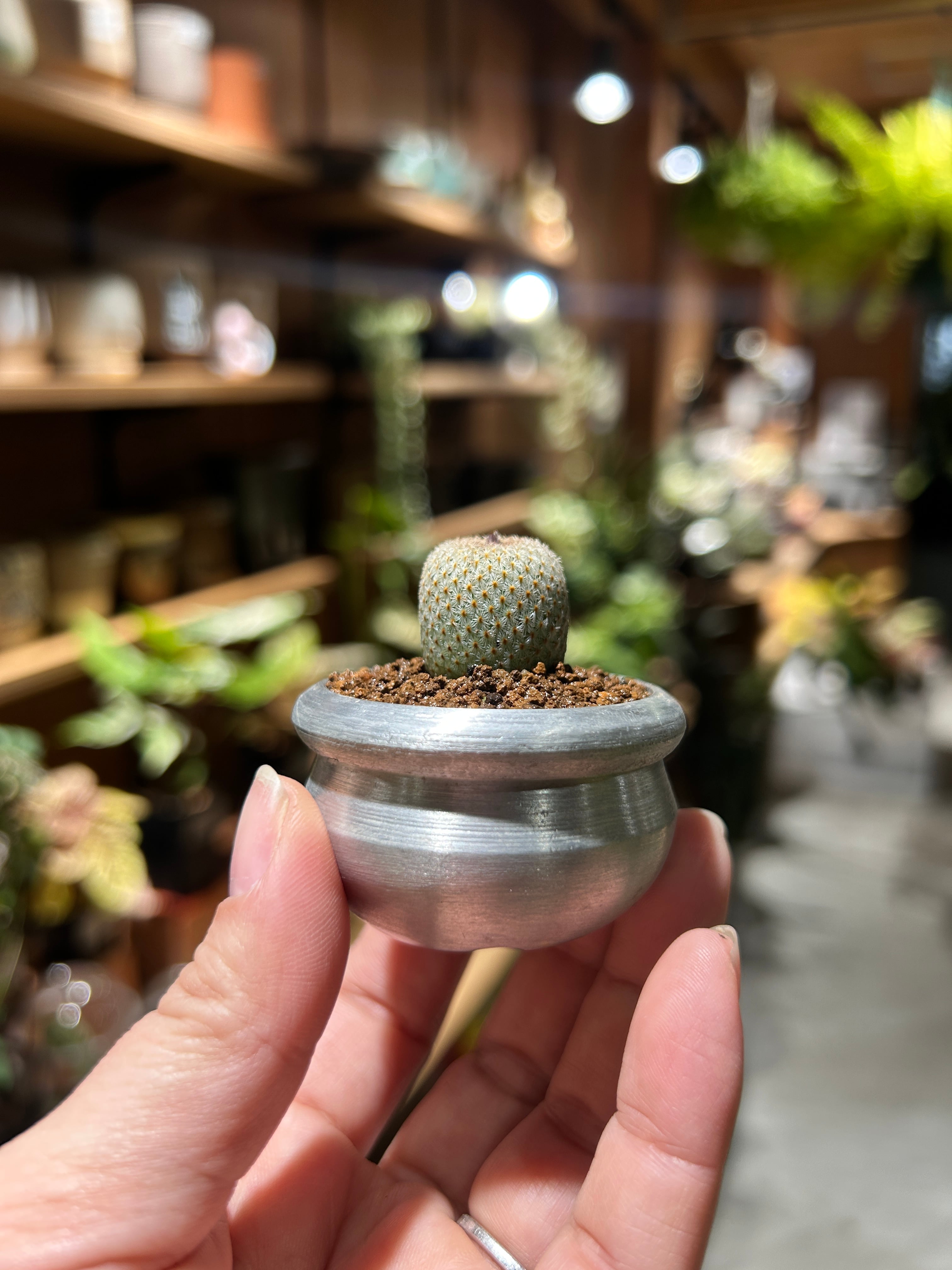 白く繊細な刺が株全体を覆い、月面のような幻想的な姿が印象的な小型サボテンです。