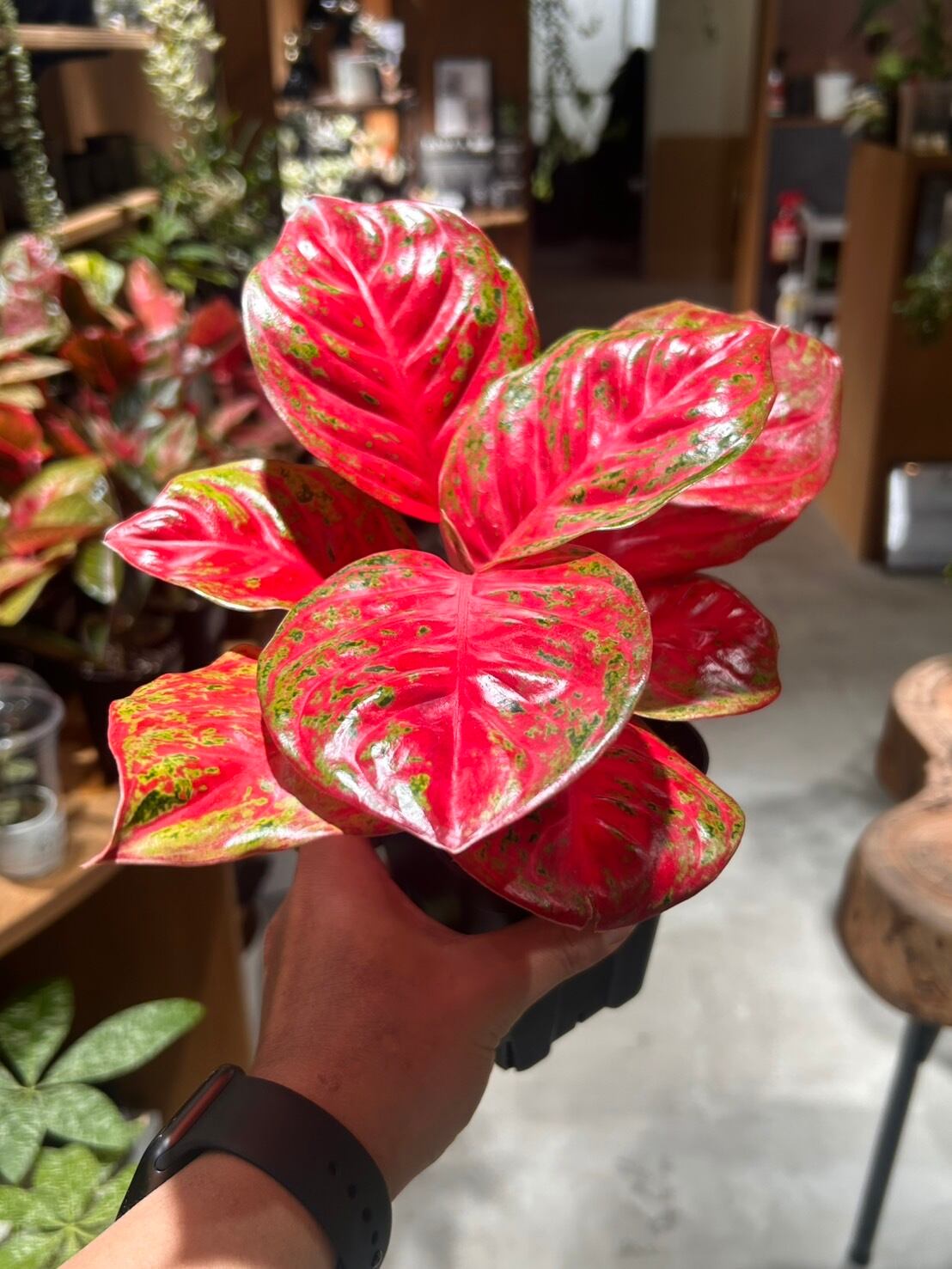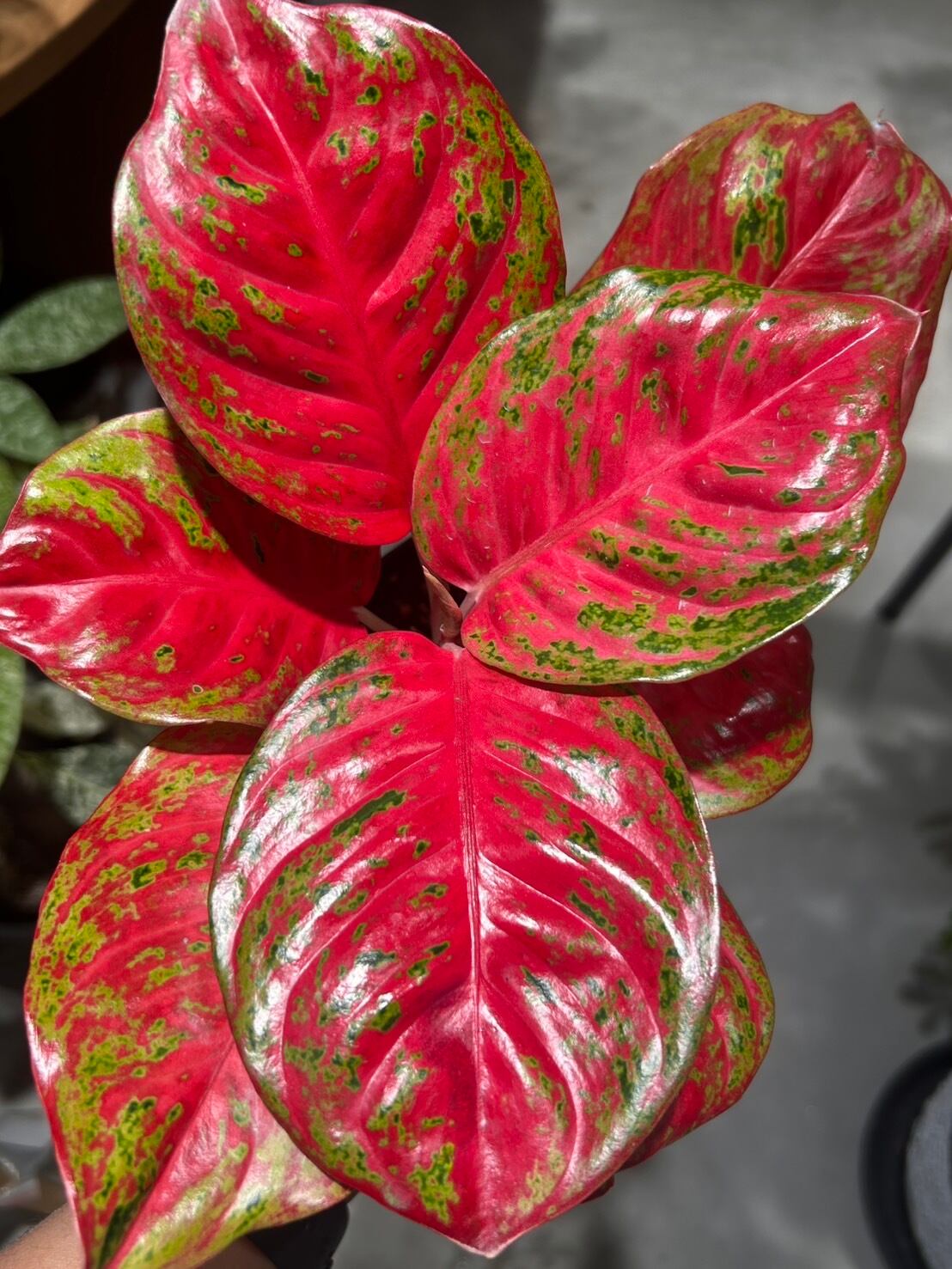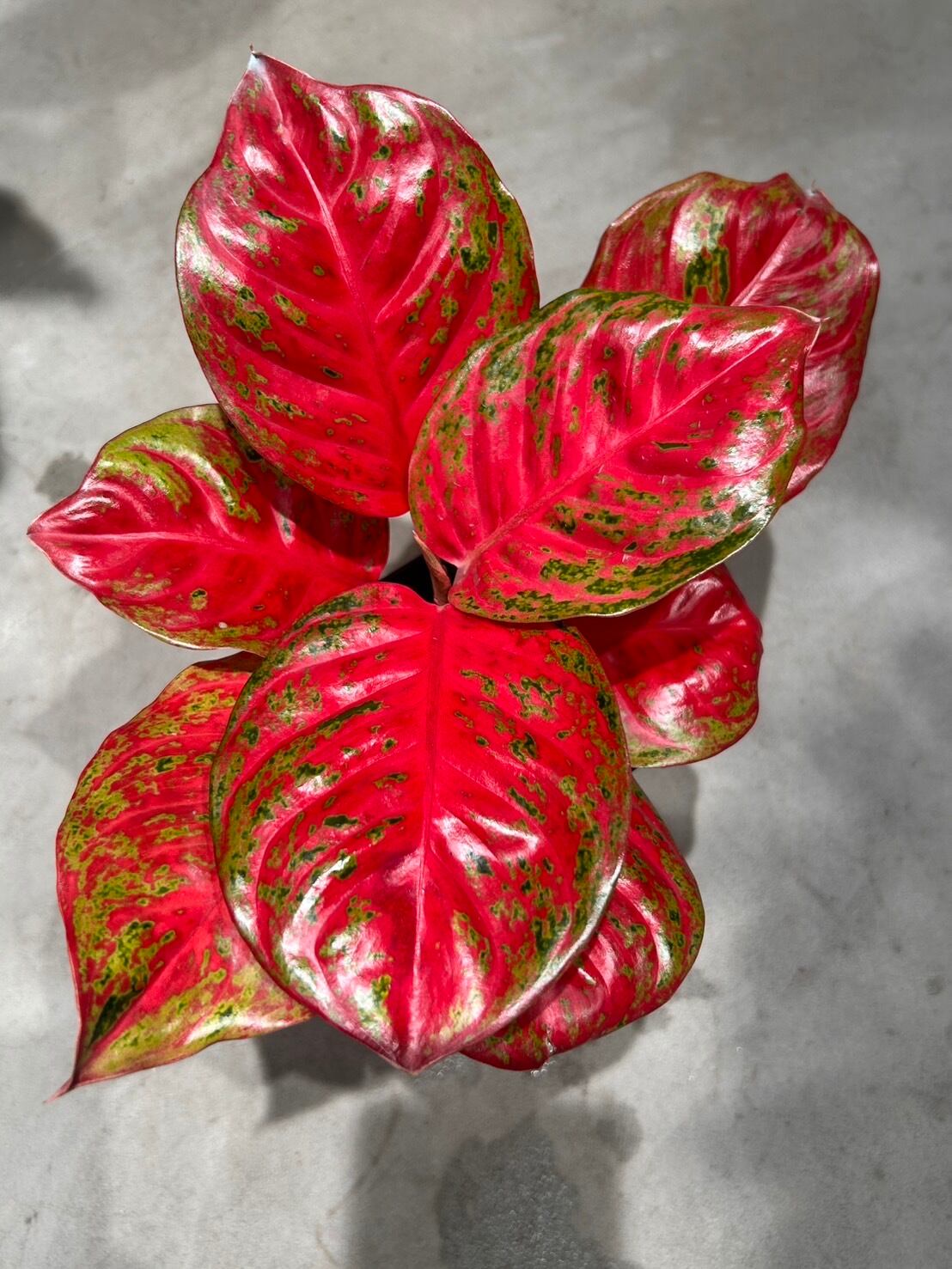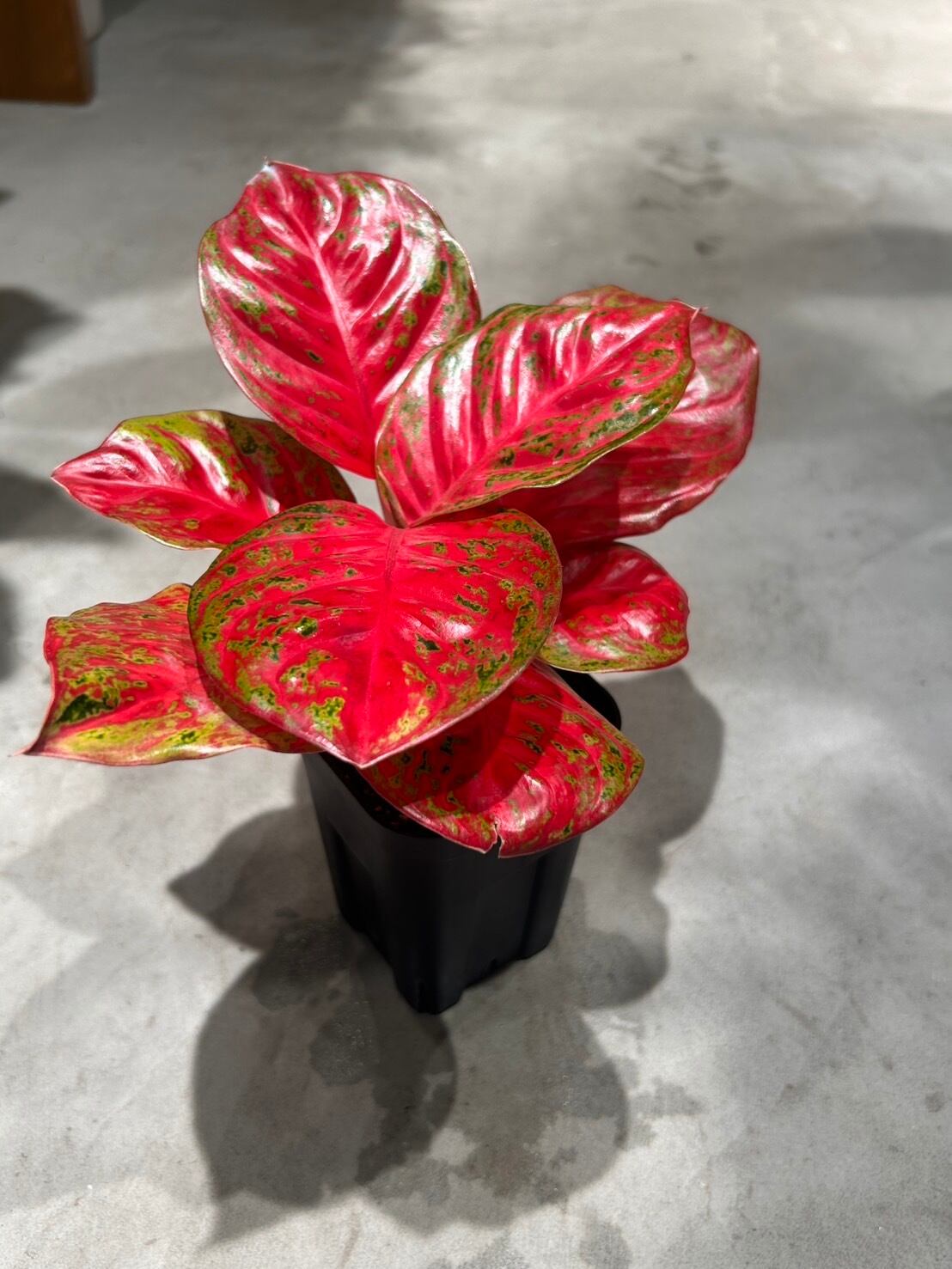 鮮やかな赤色にグリーンの斑が入る、美しいカラーリーフです。