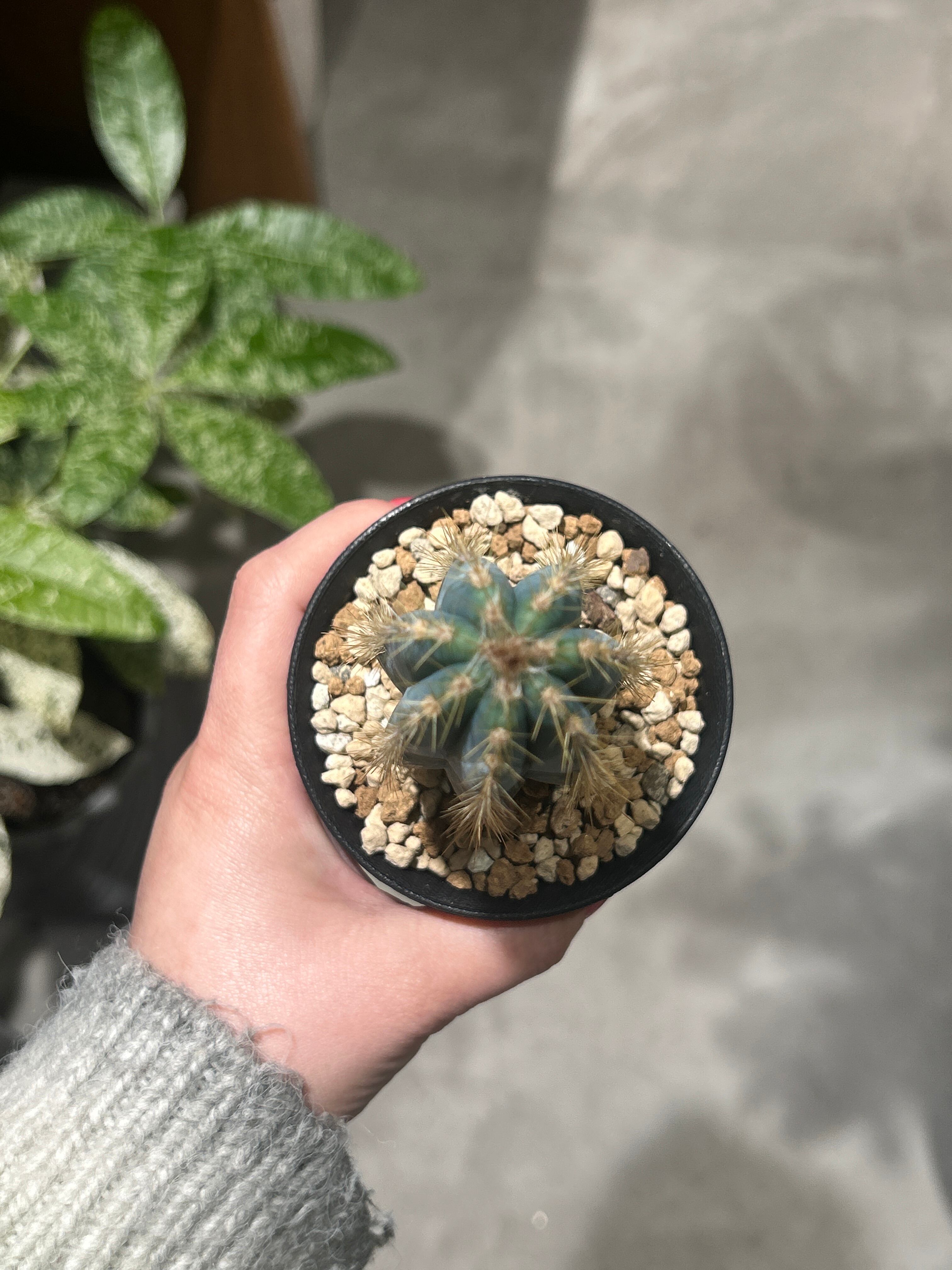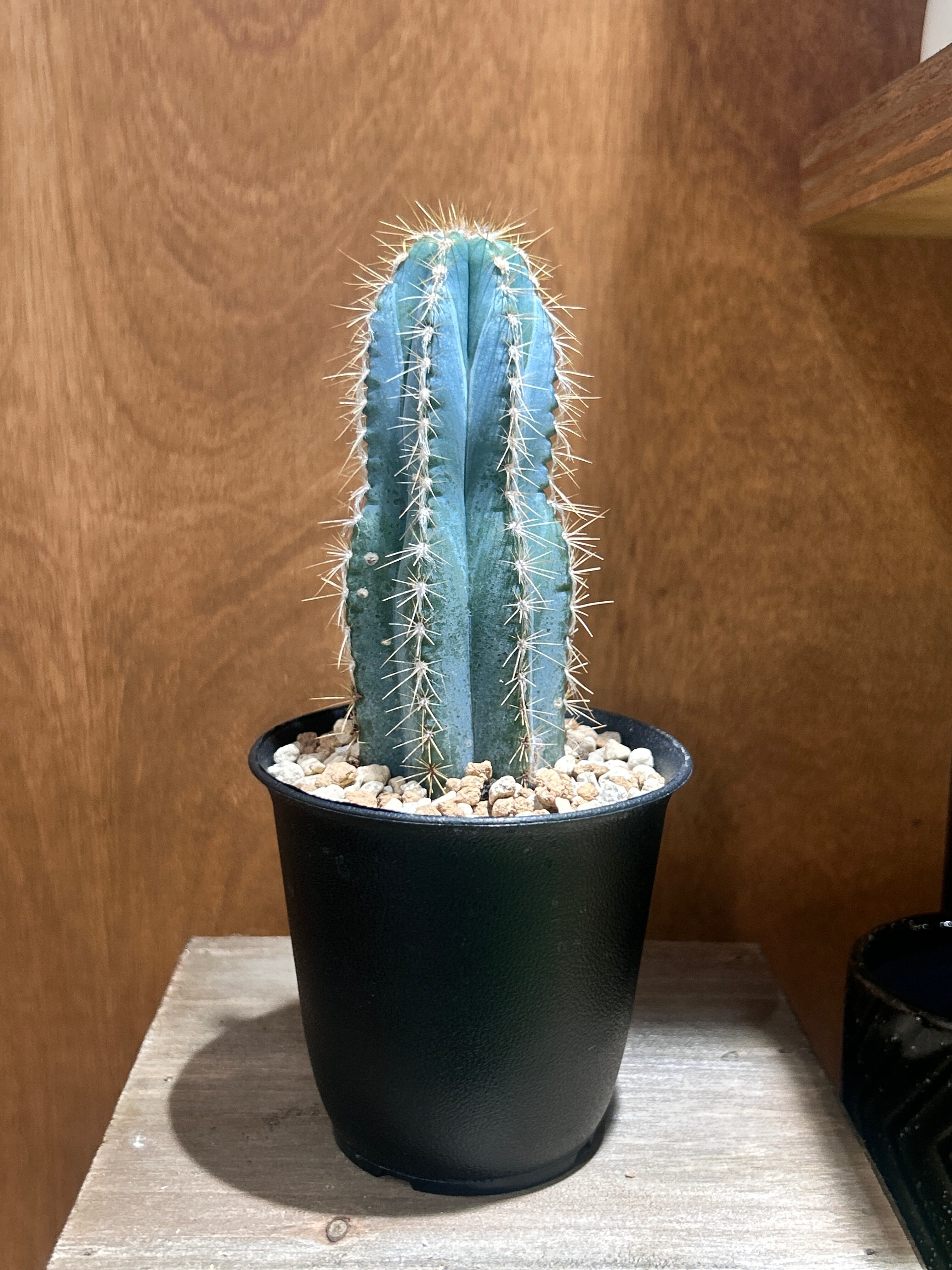 青みがかった美しい肌色と、白い綿毛状の刺座が特徴の柱サボテン。