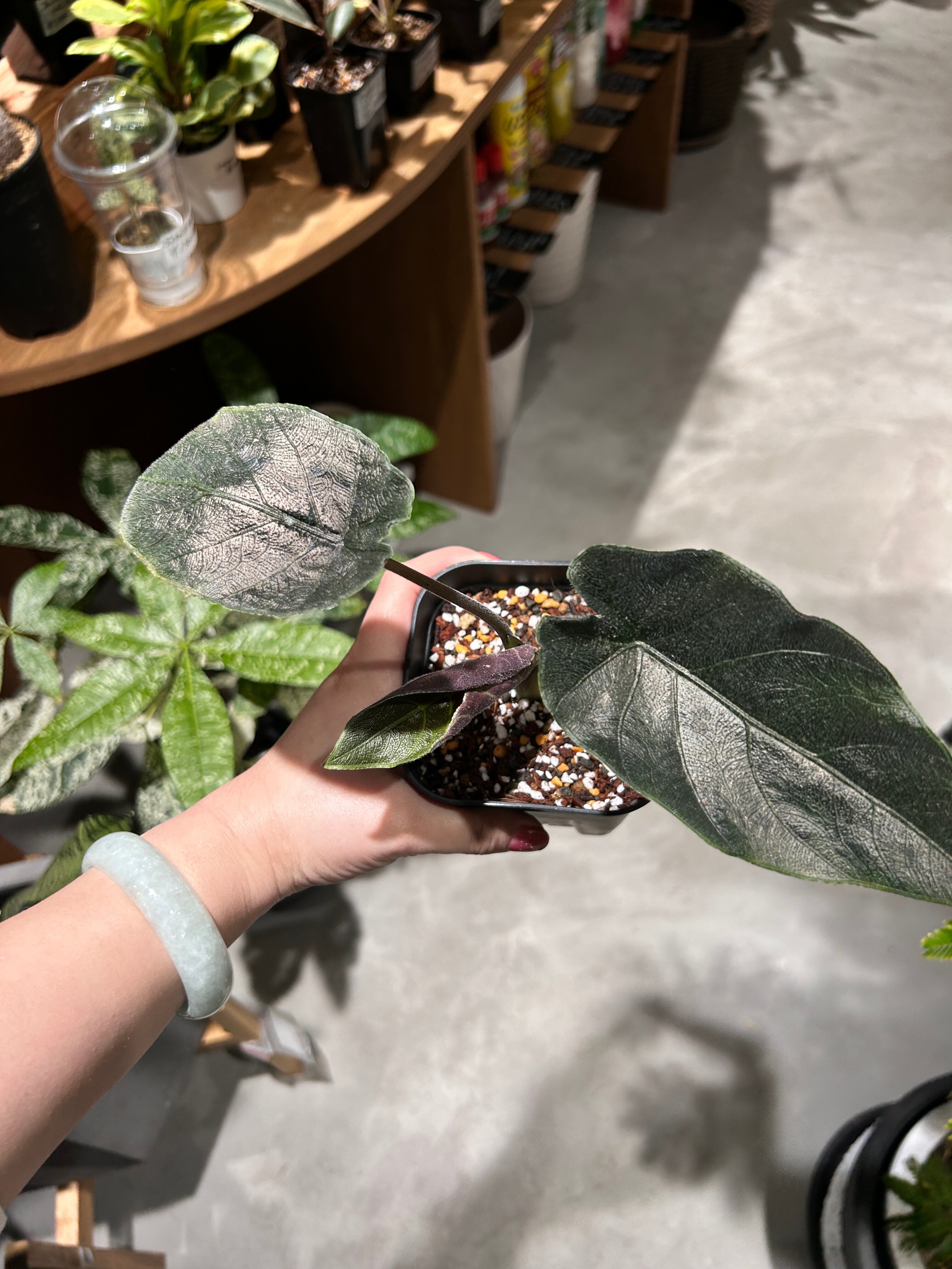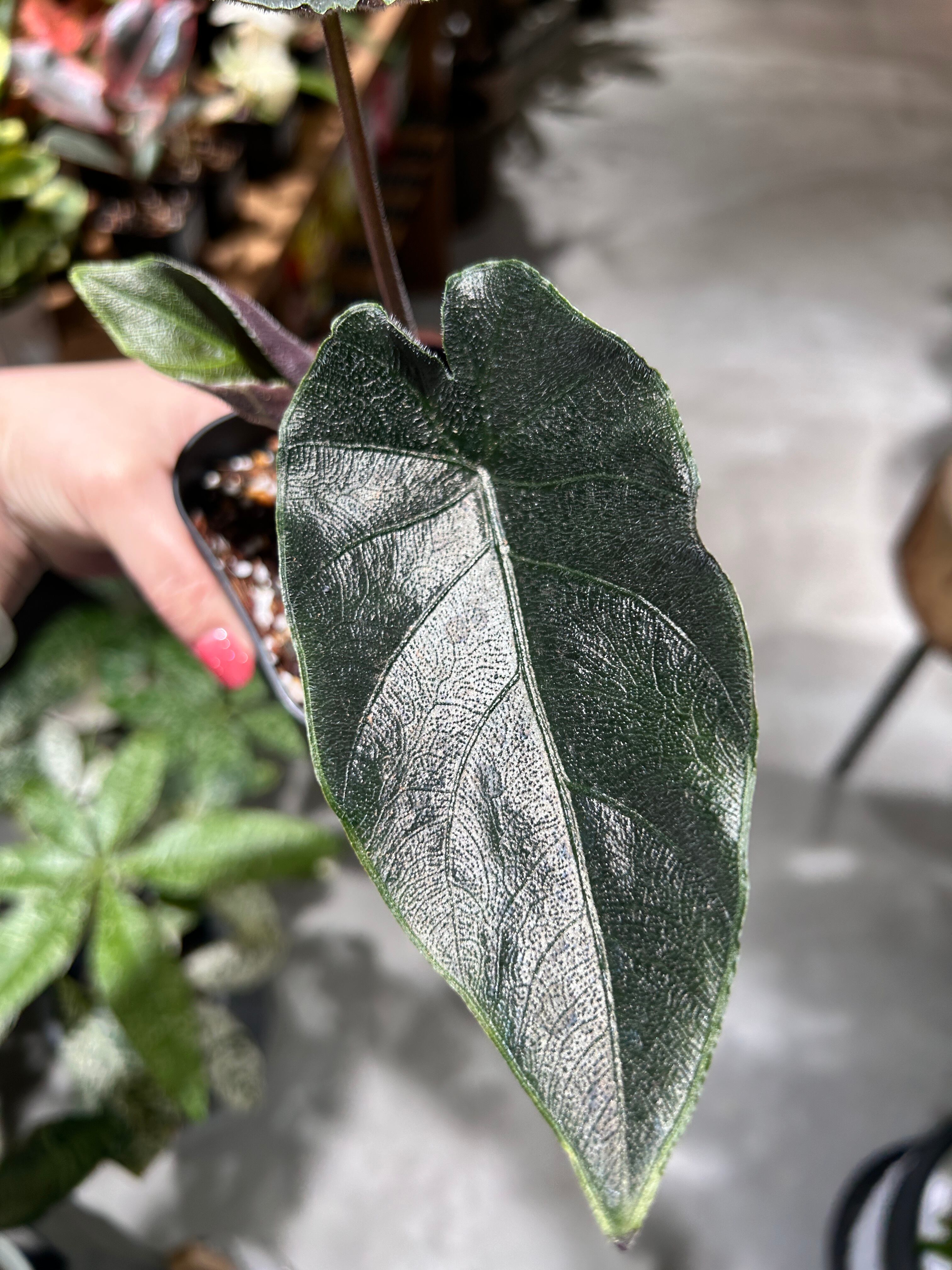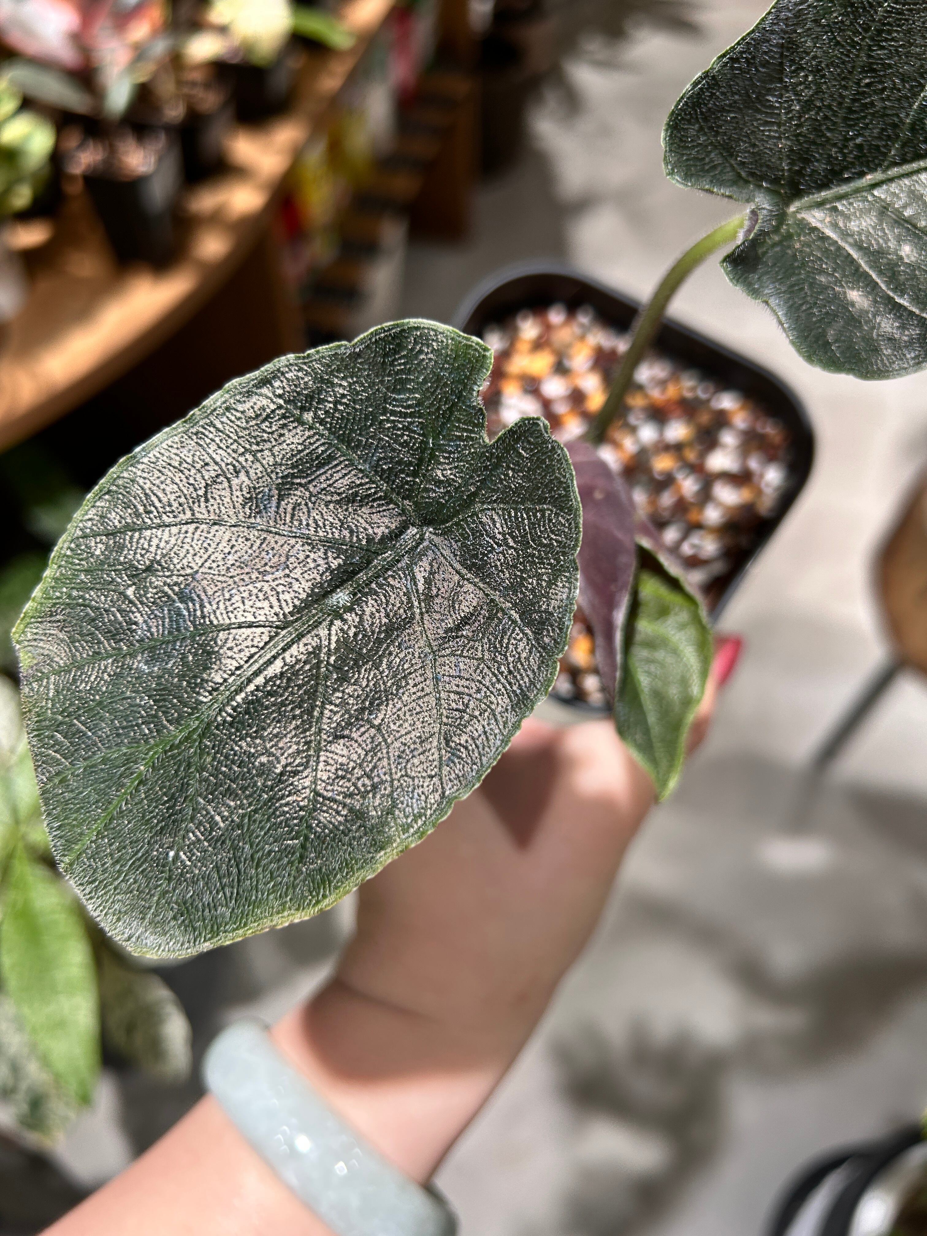 浮かび上がるシルバーの葉脈がまるでメタリックアートのような存在感を放ちます。