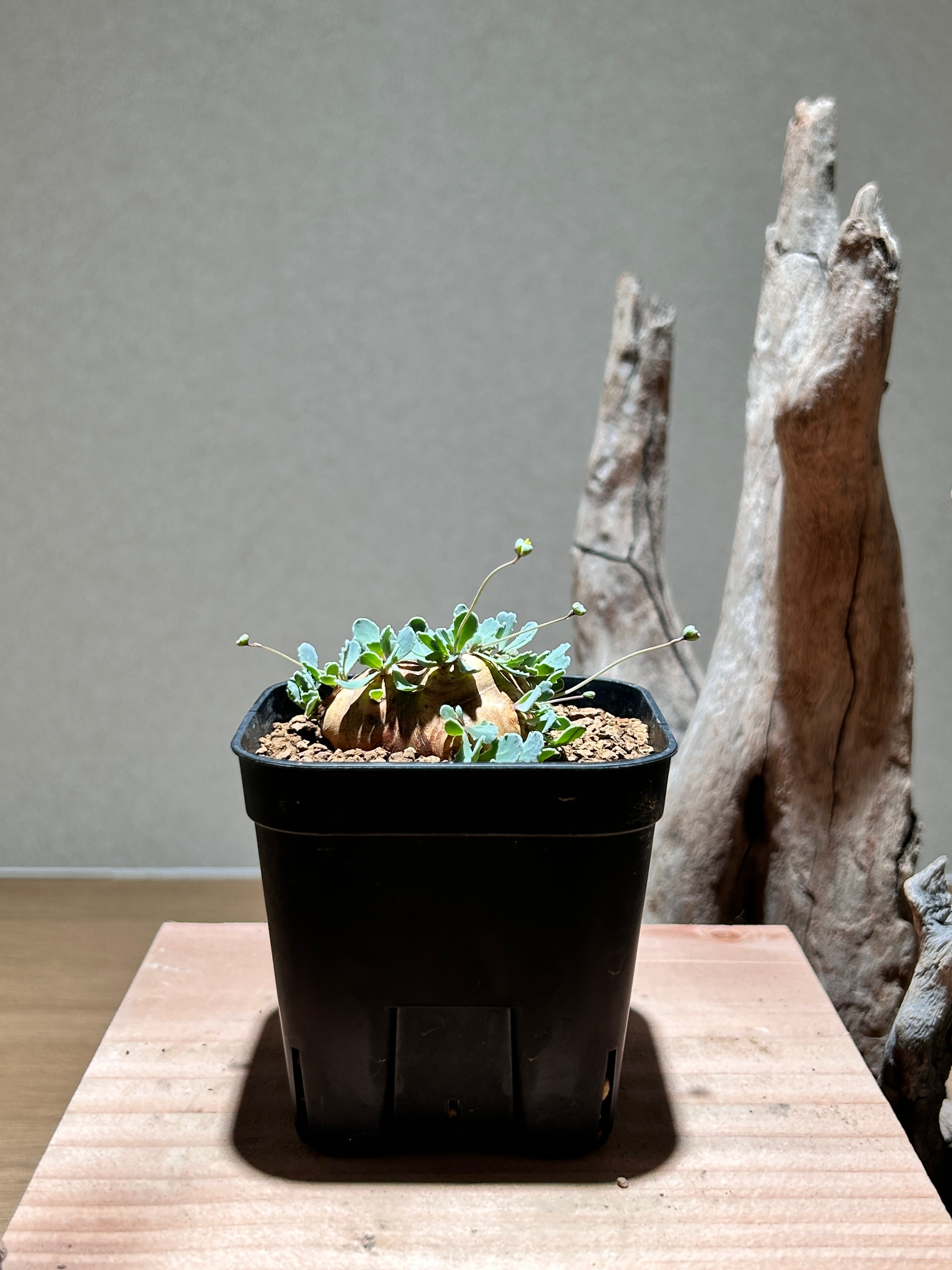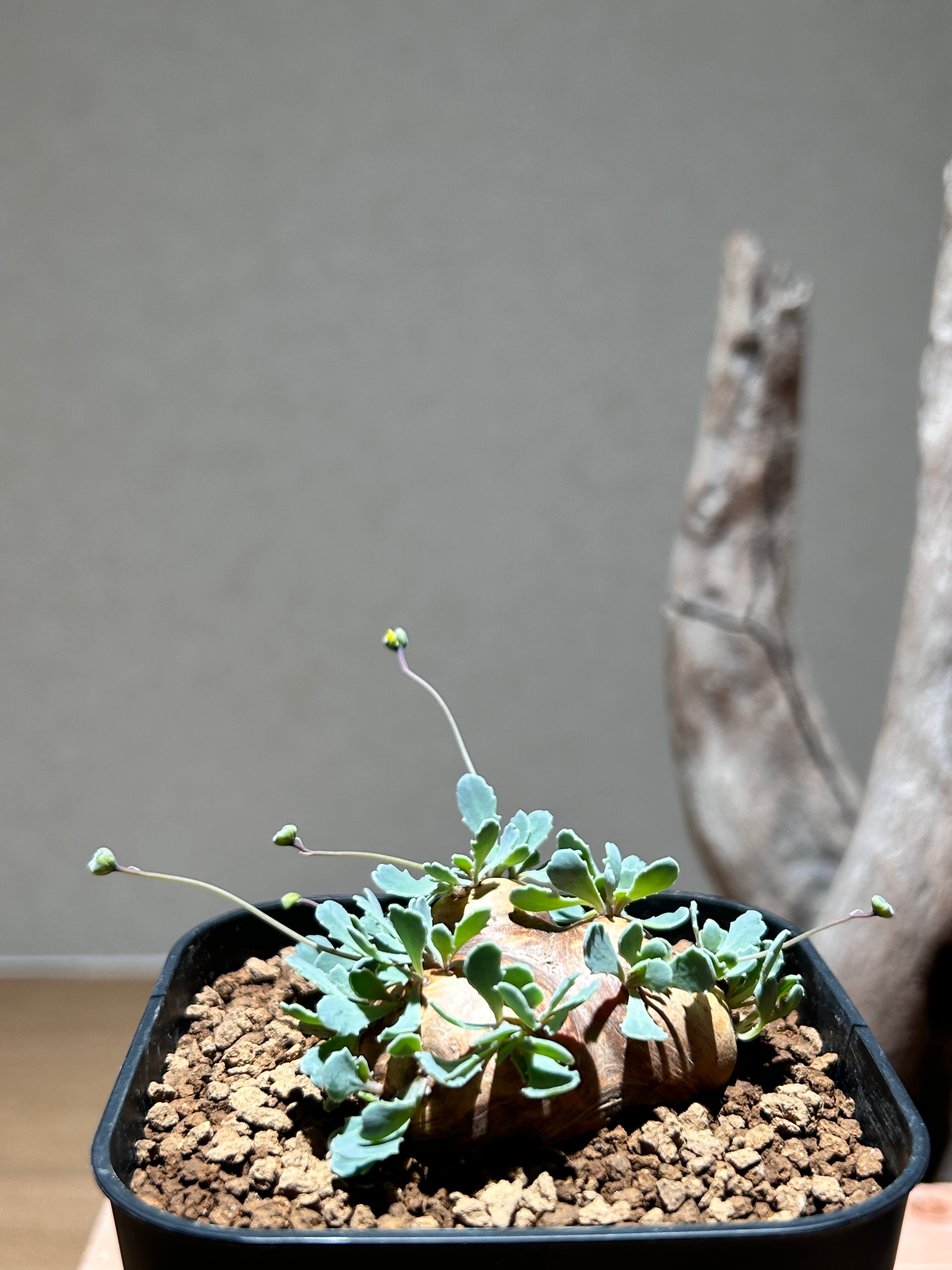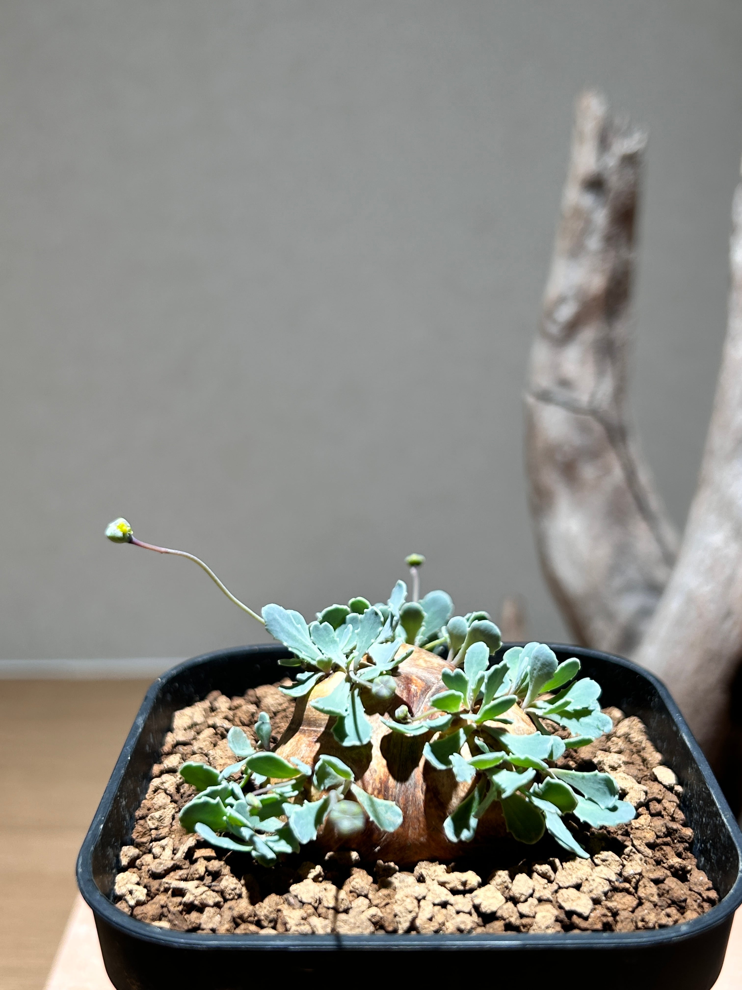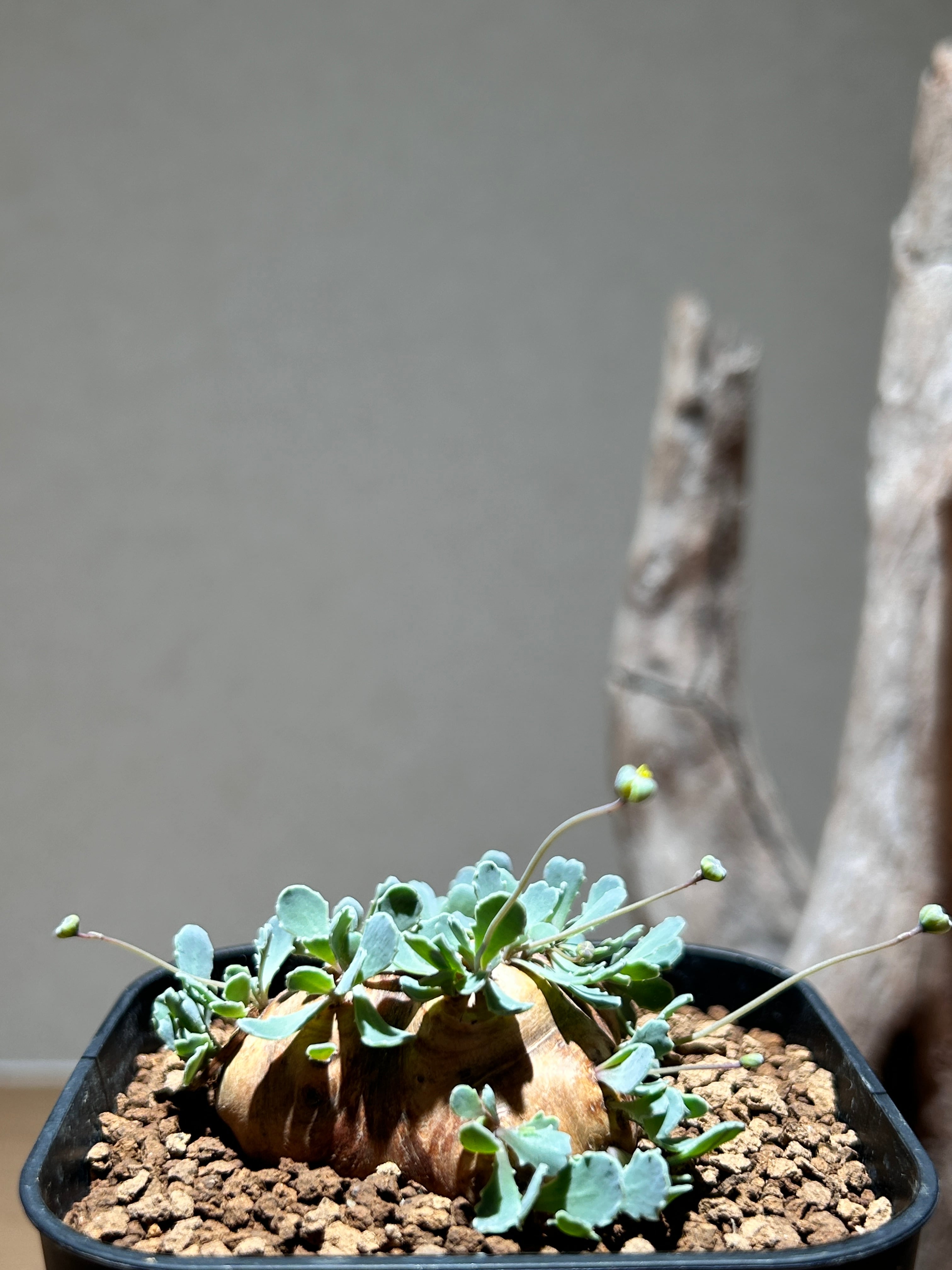 荒々しい塊根部と繊細なシルバーグリーンの葉の