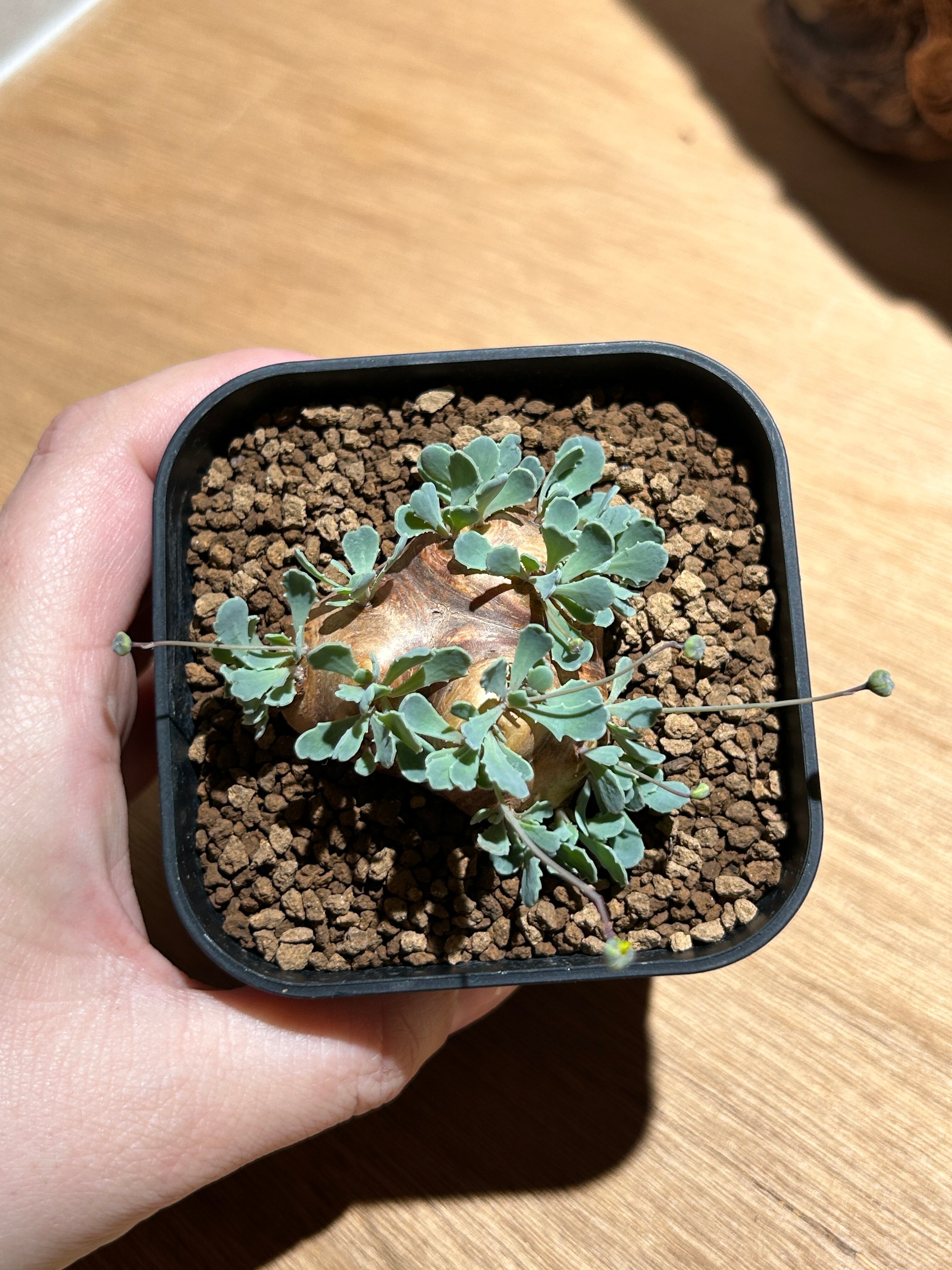 丸く膨らんだ塊根から、フリルのような可愛らしい葉を