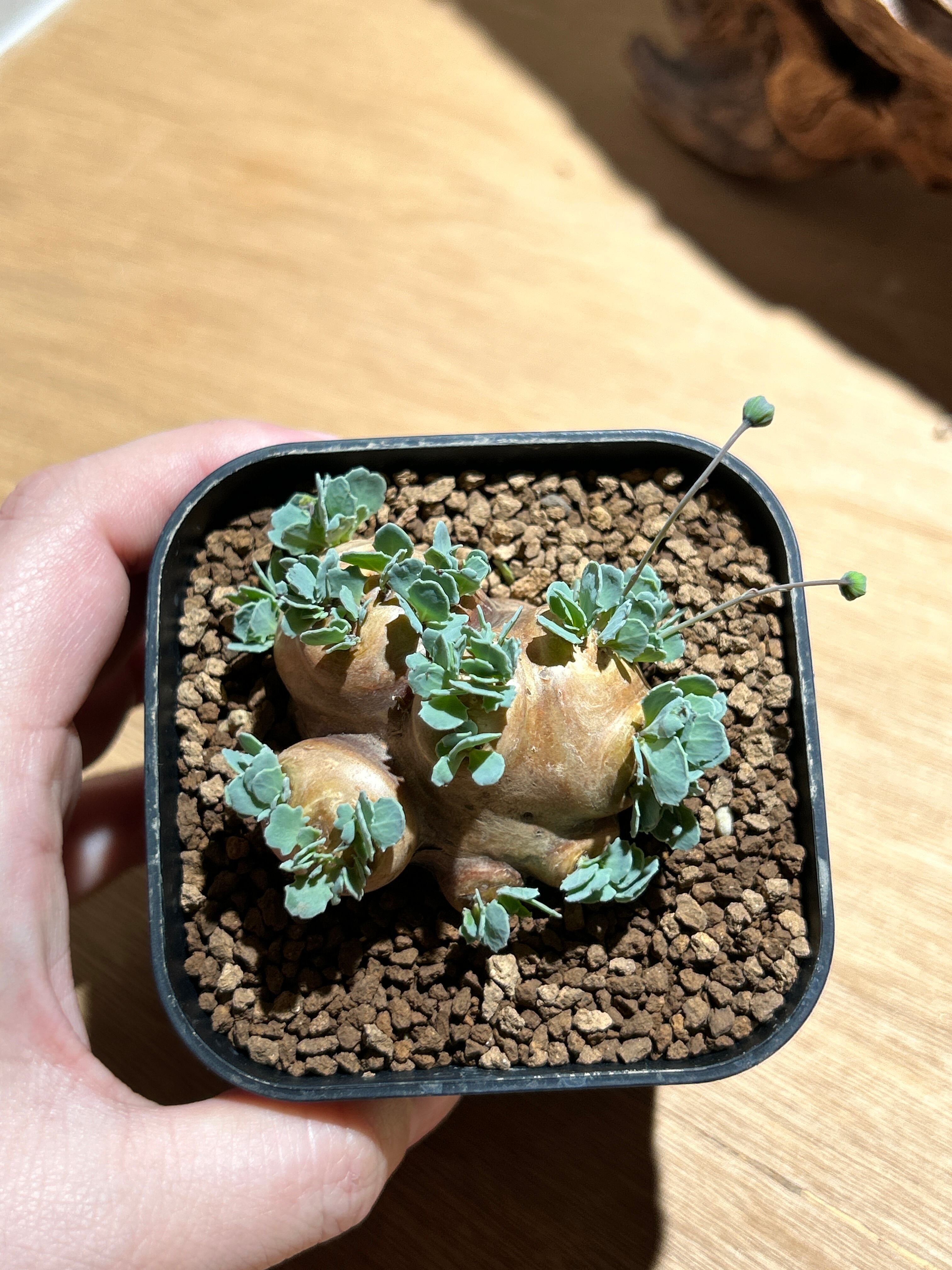 丸く膨らんだ塊根から、フリルのような可愛らしい葉を