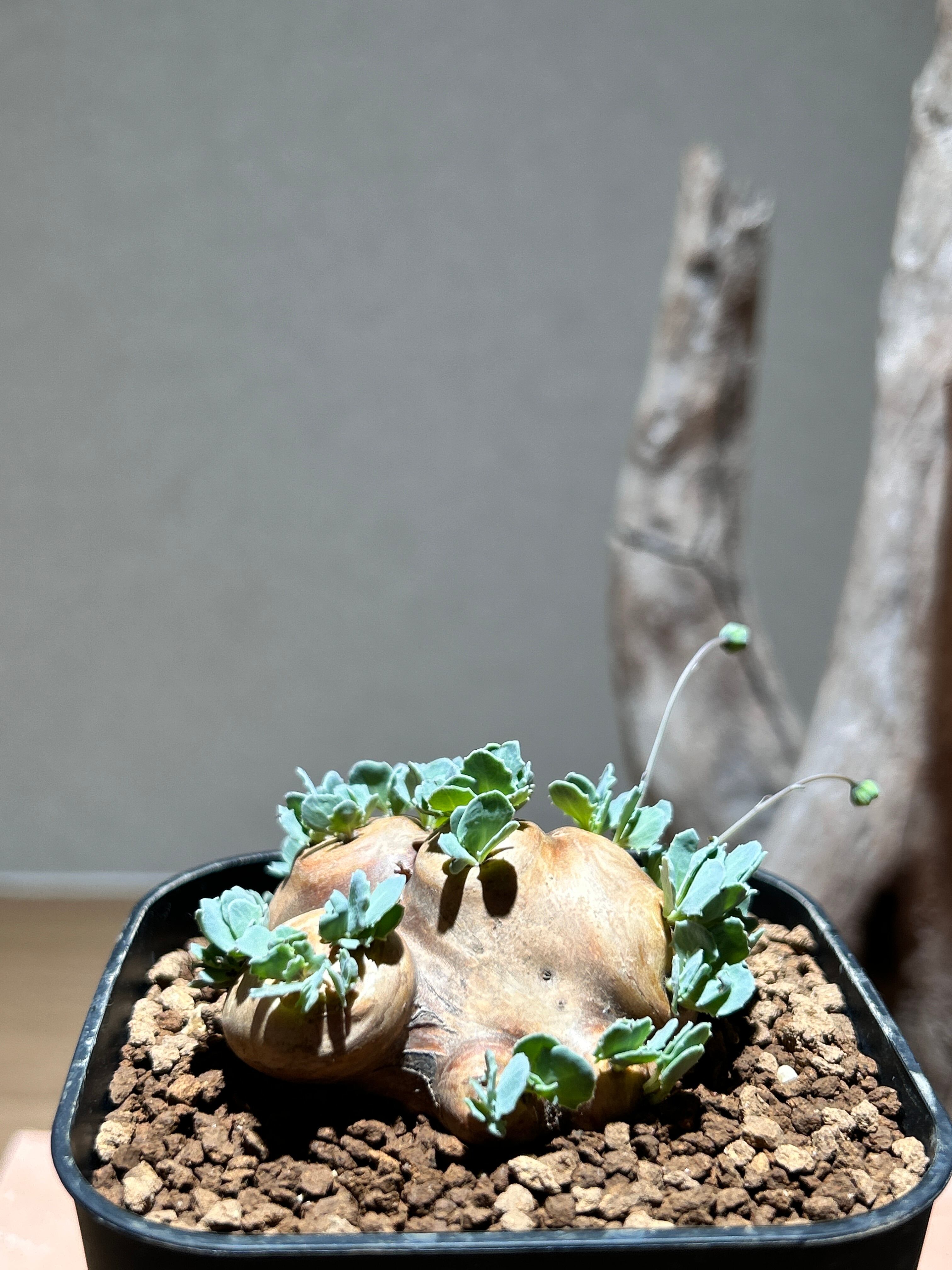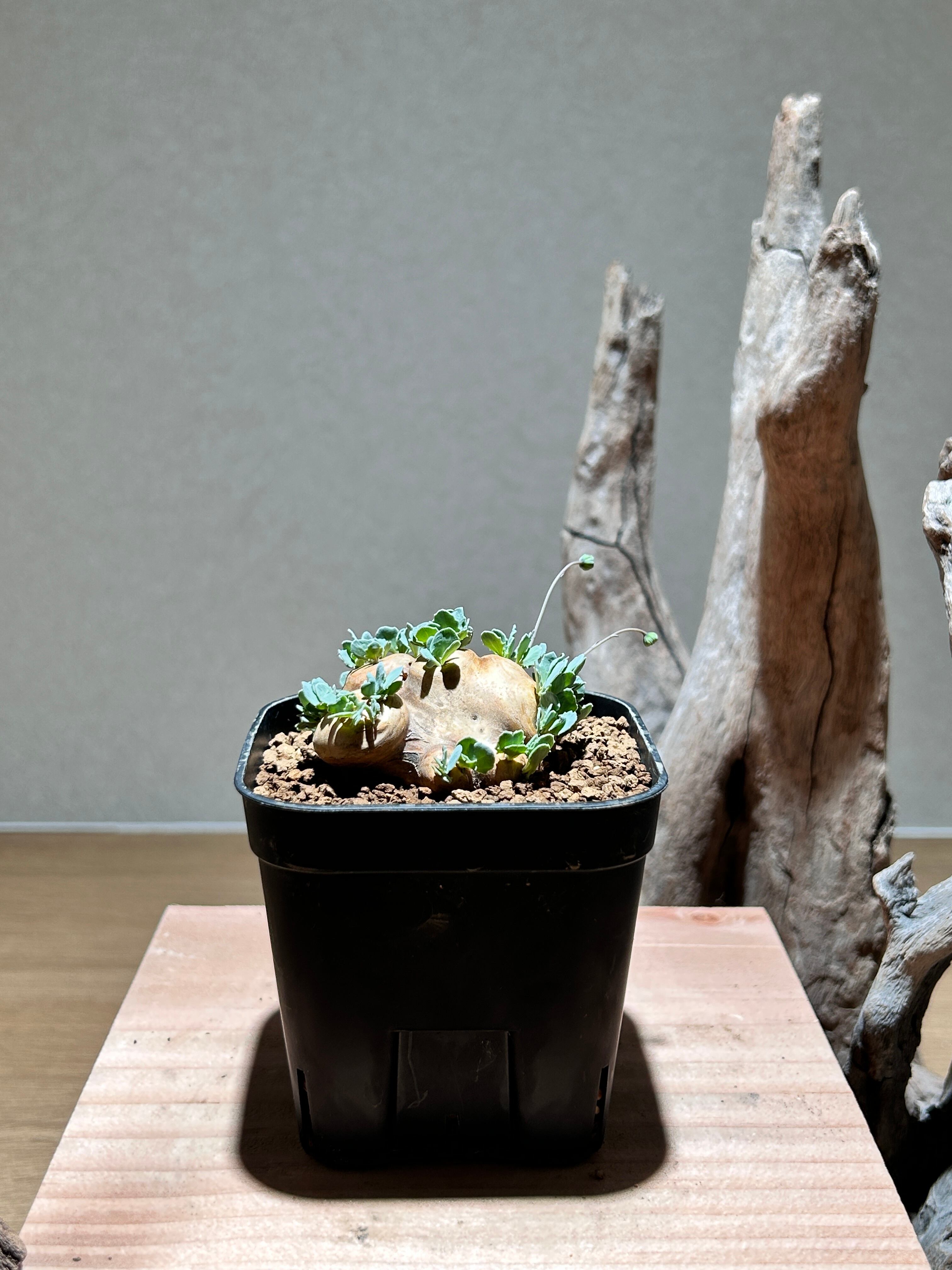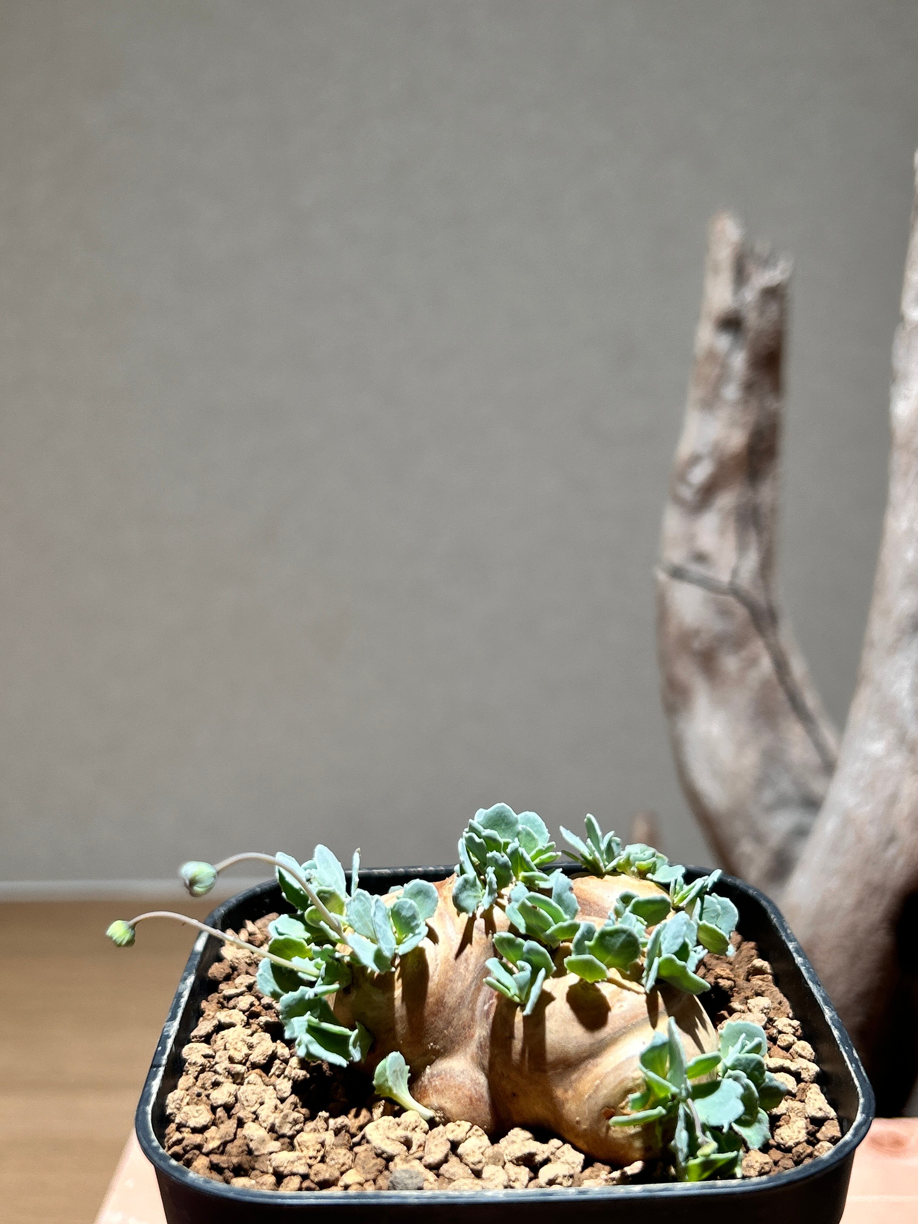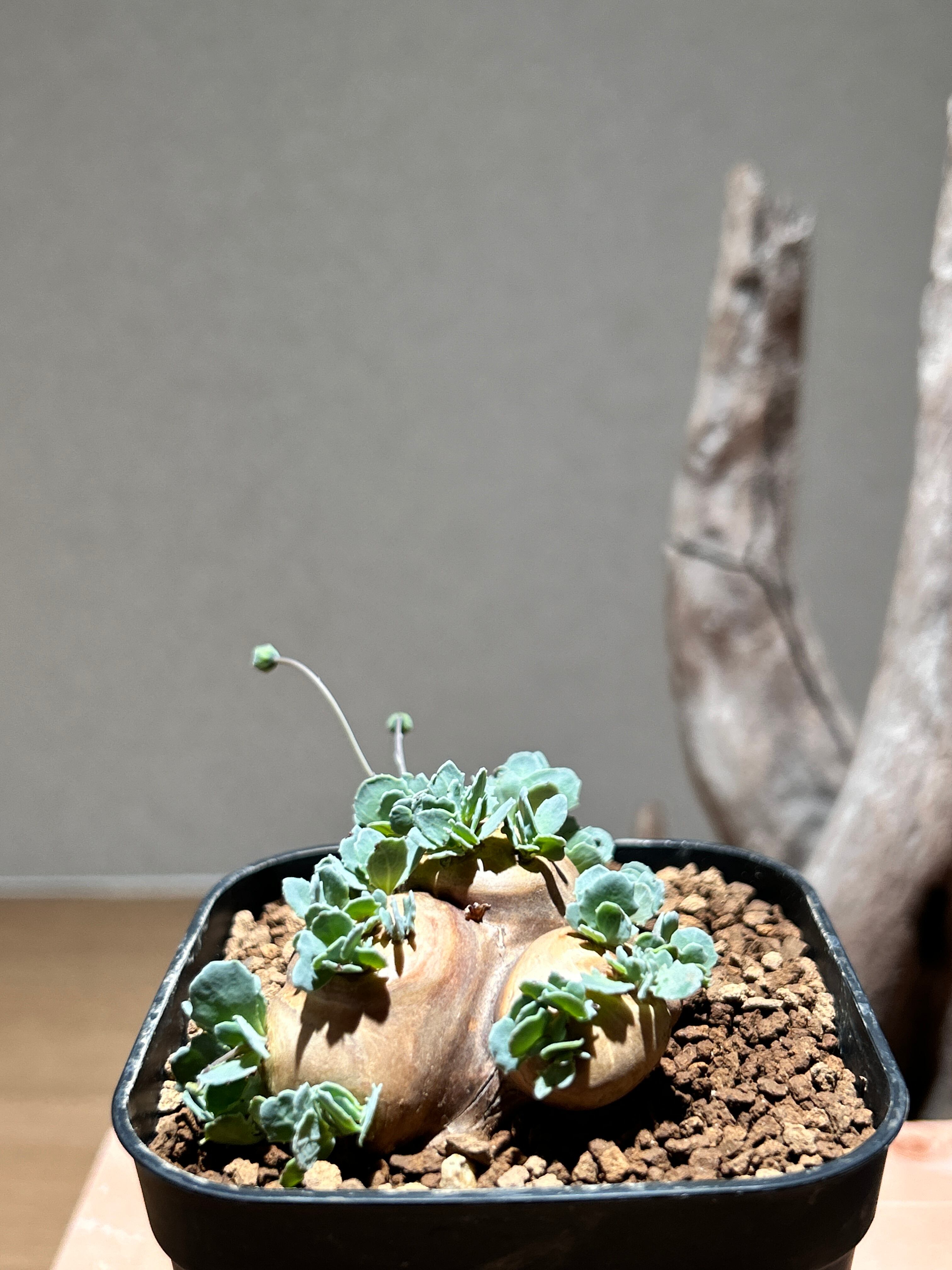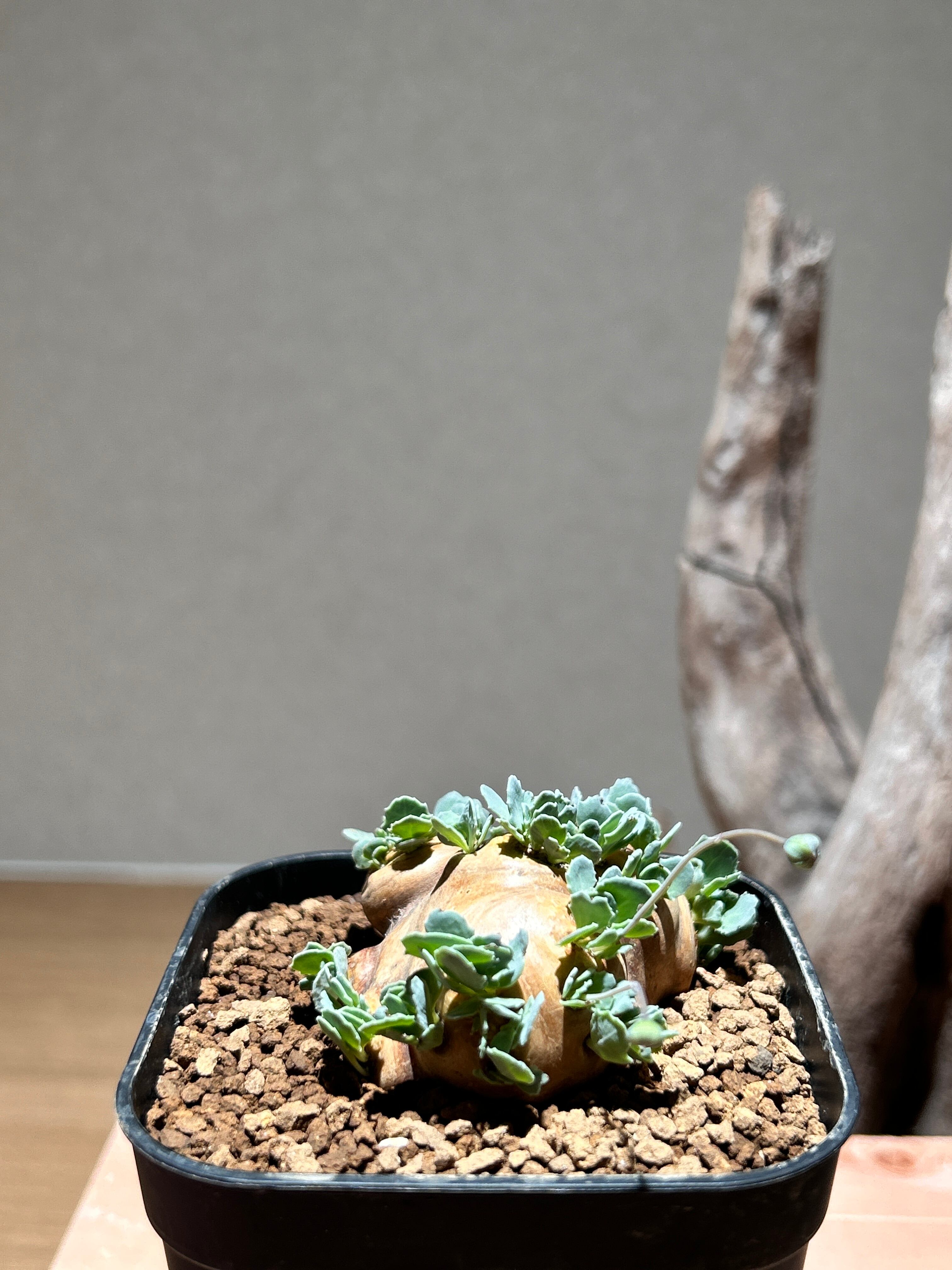 荒々しい塊根部と繊細なシルバーグリーンの葉の