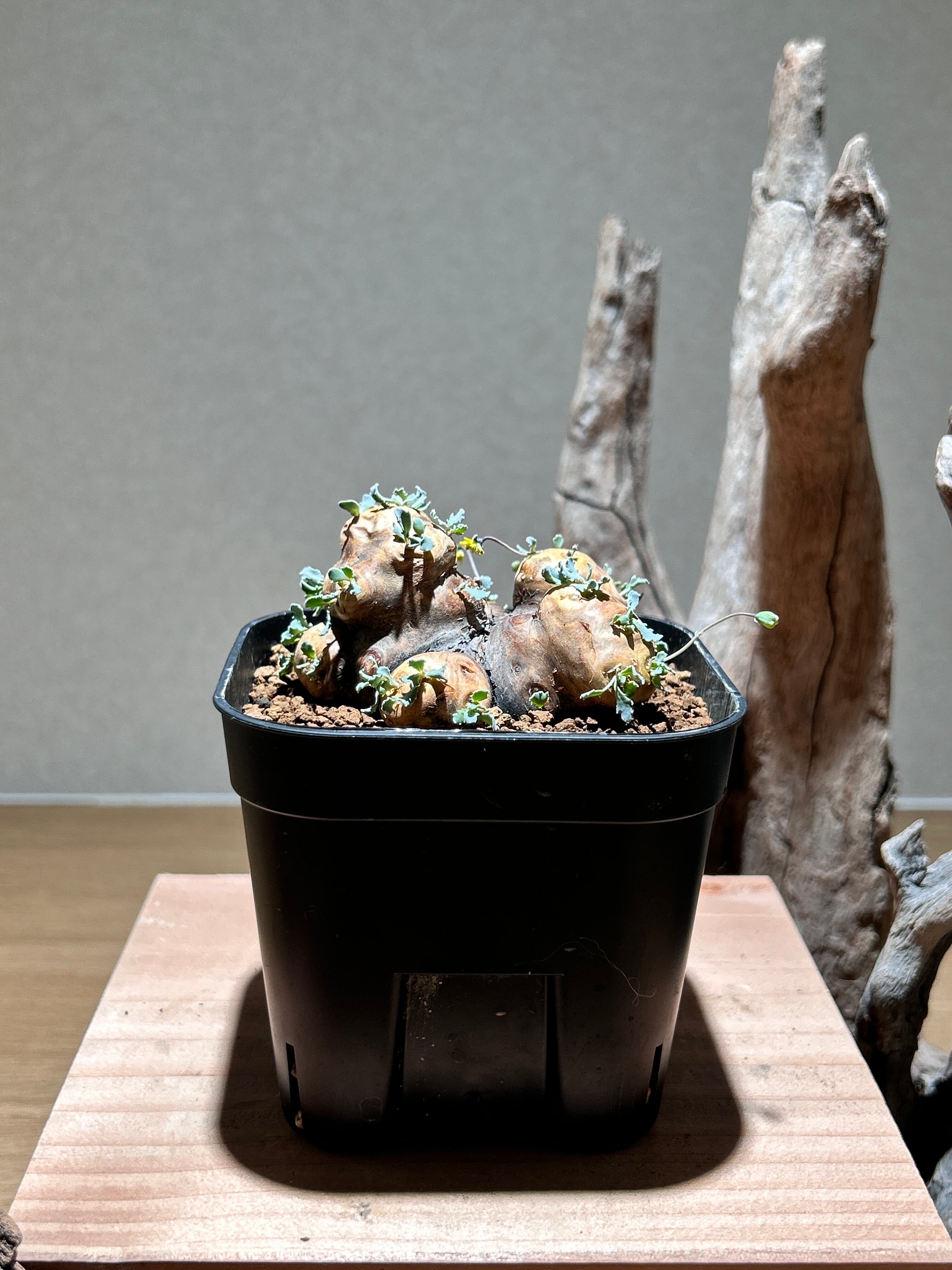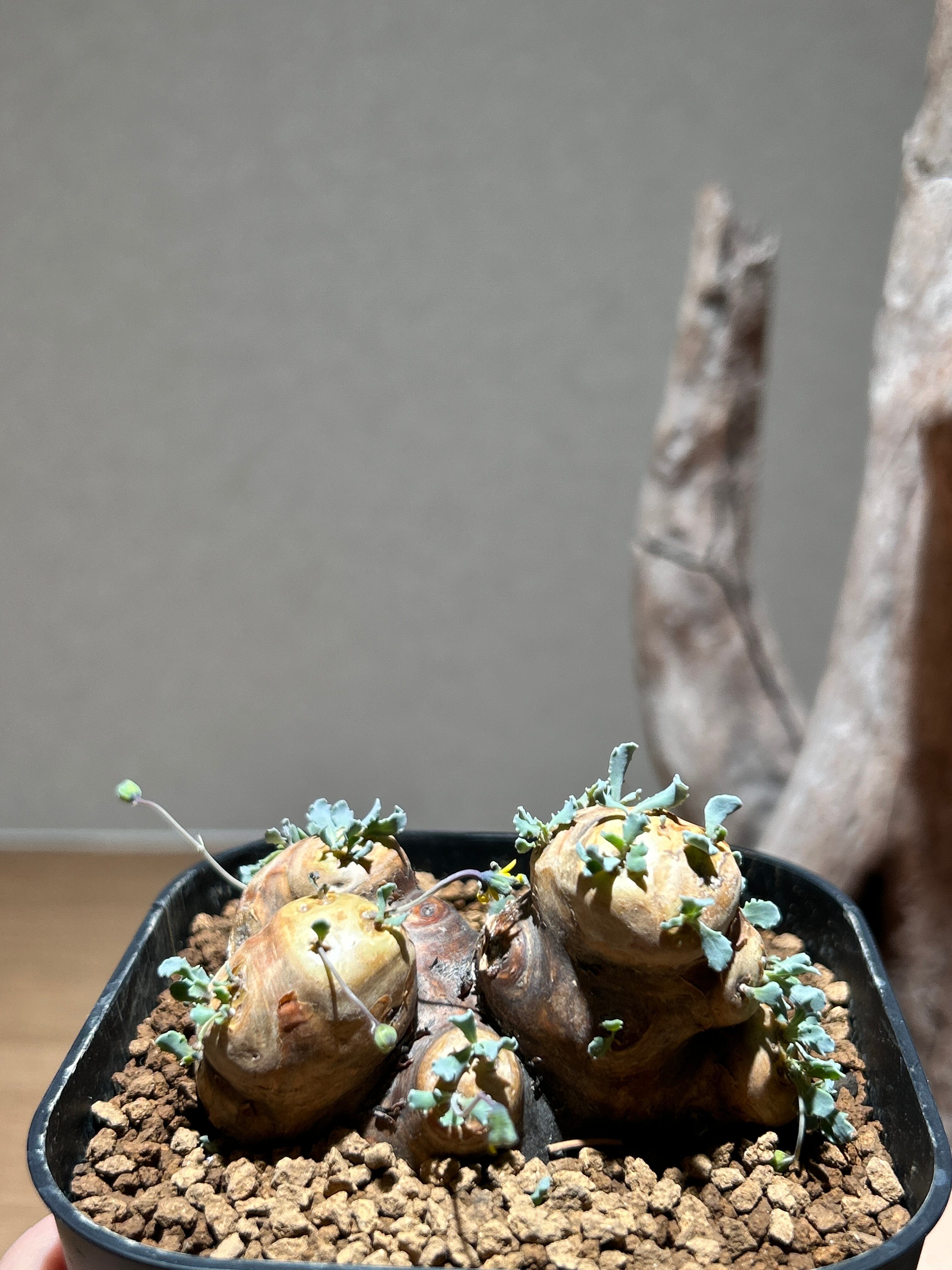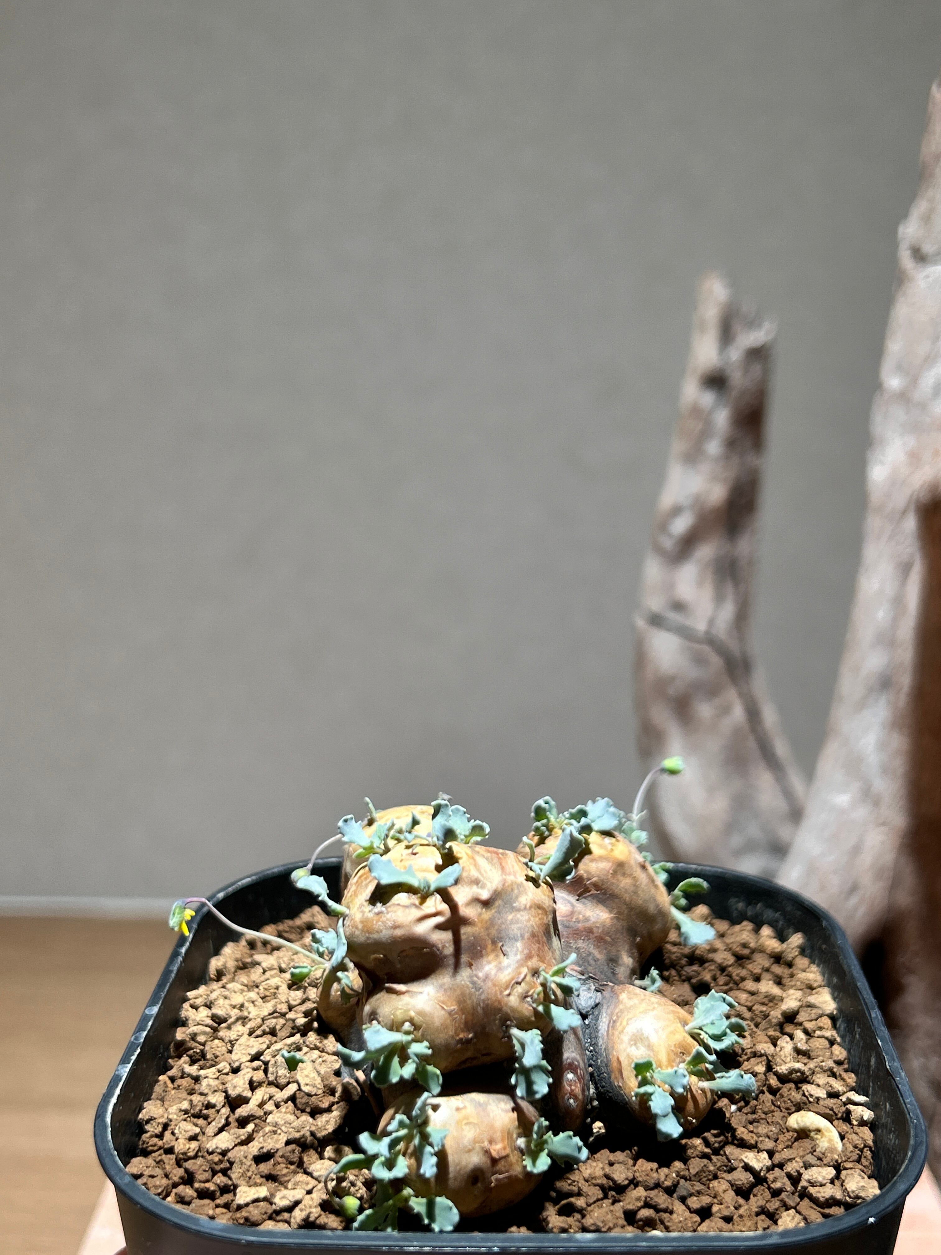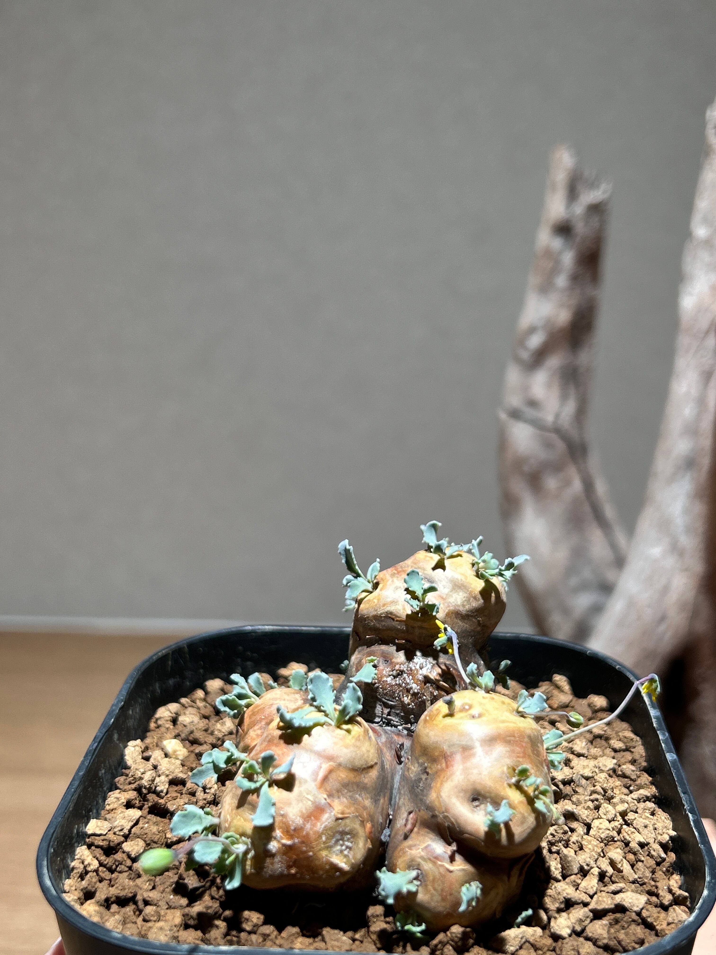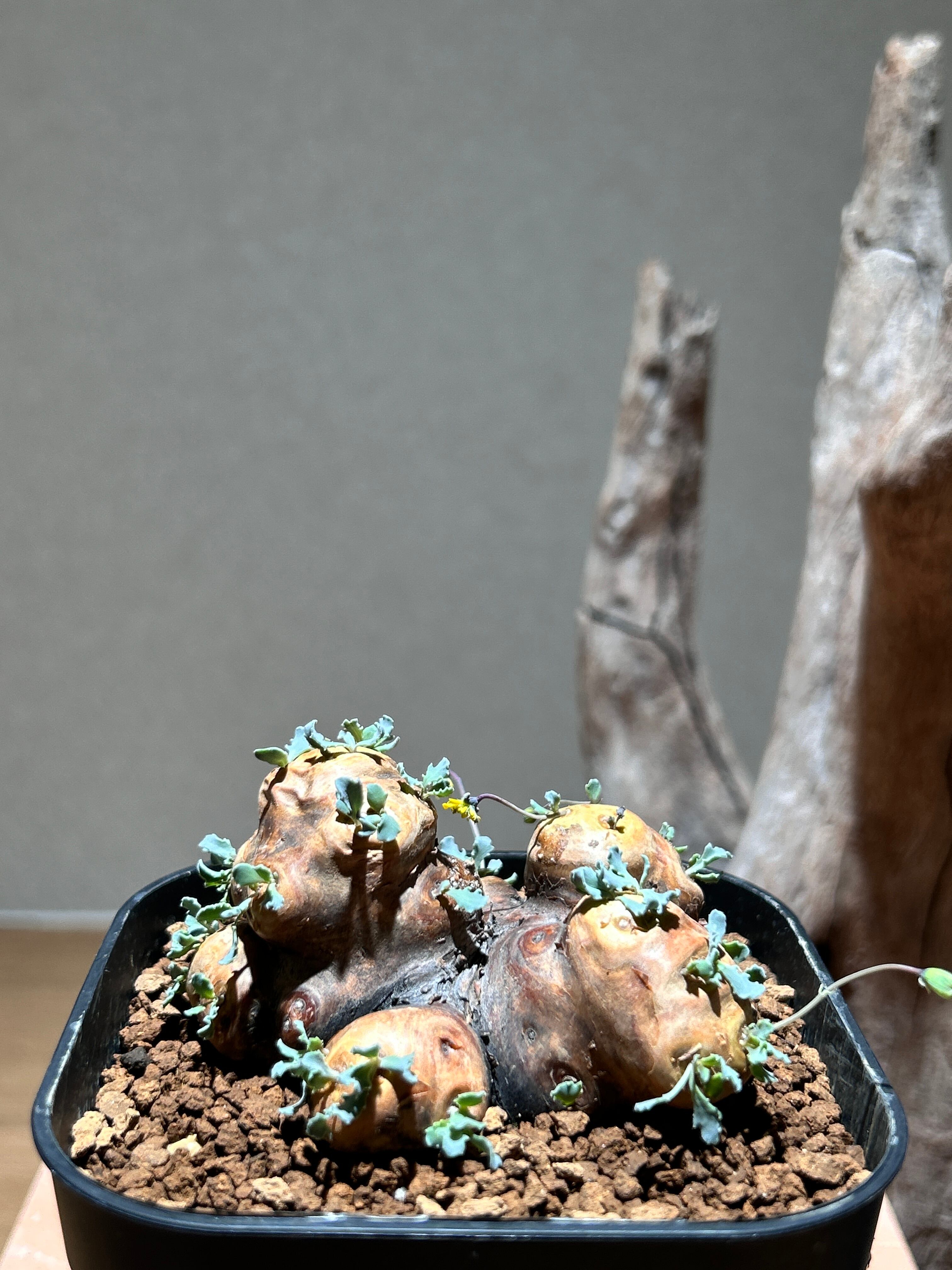 荒々しい塊根部と繊細なシルバーグリーンの葉の