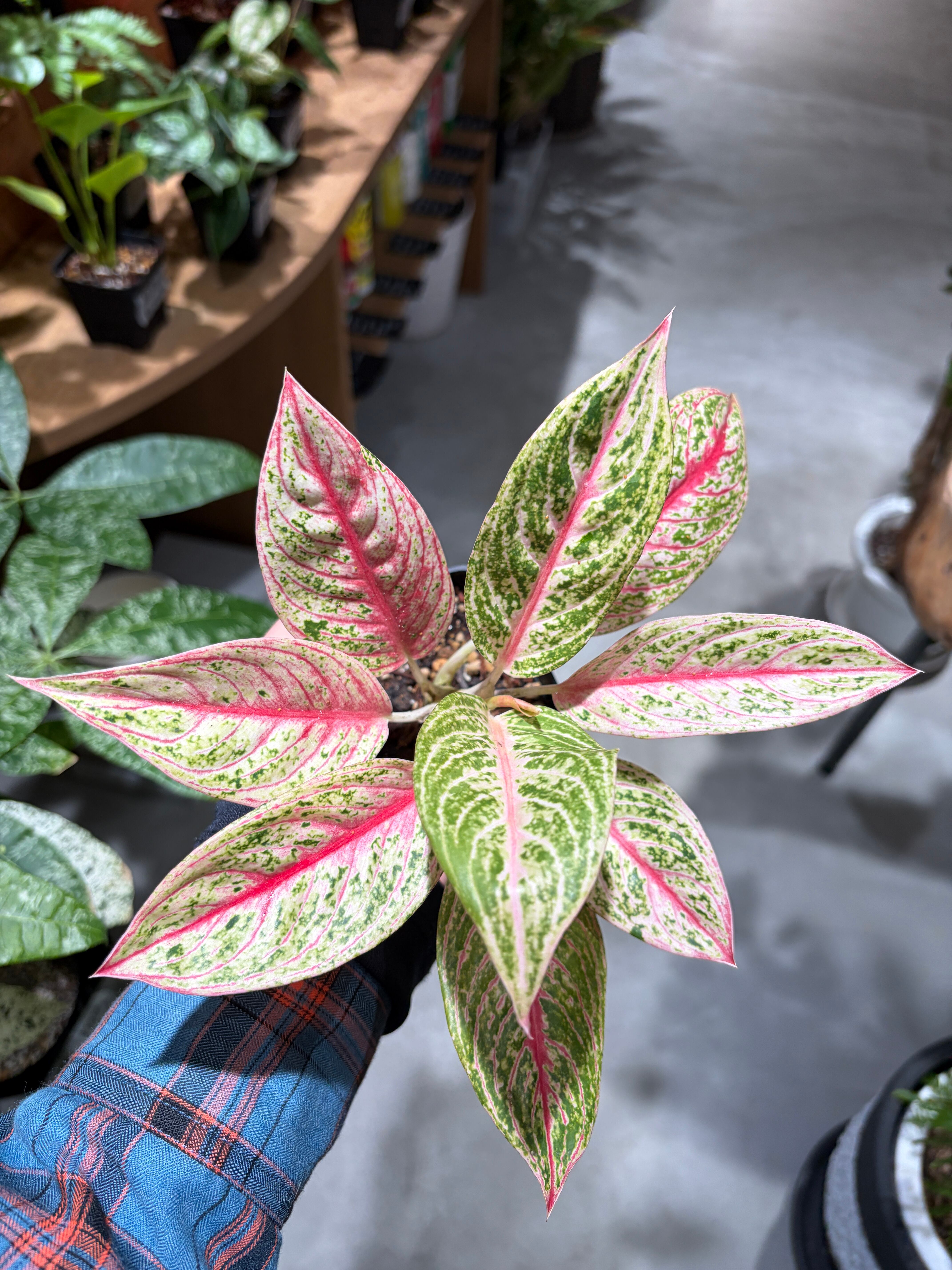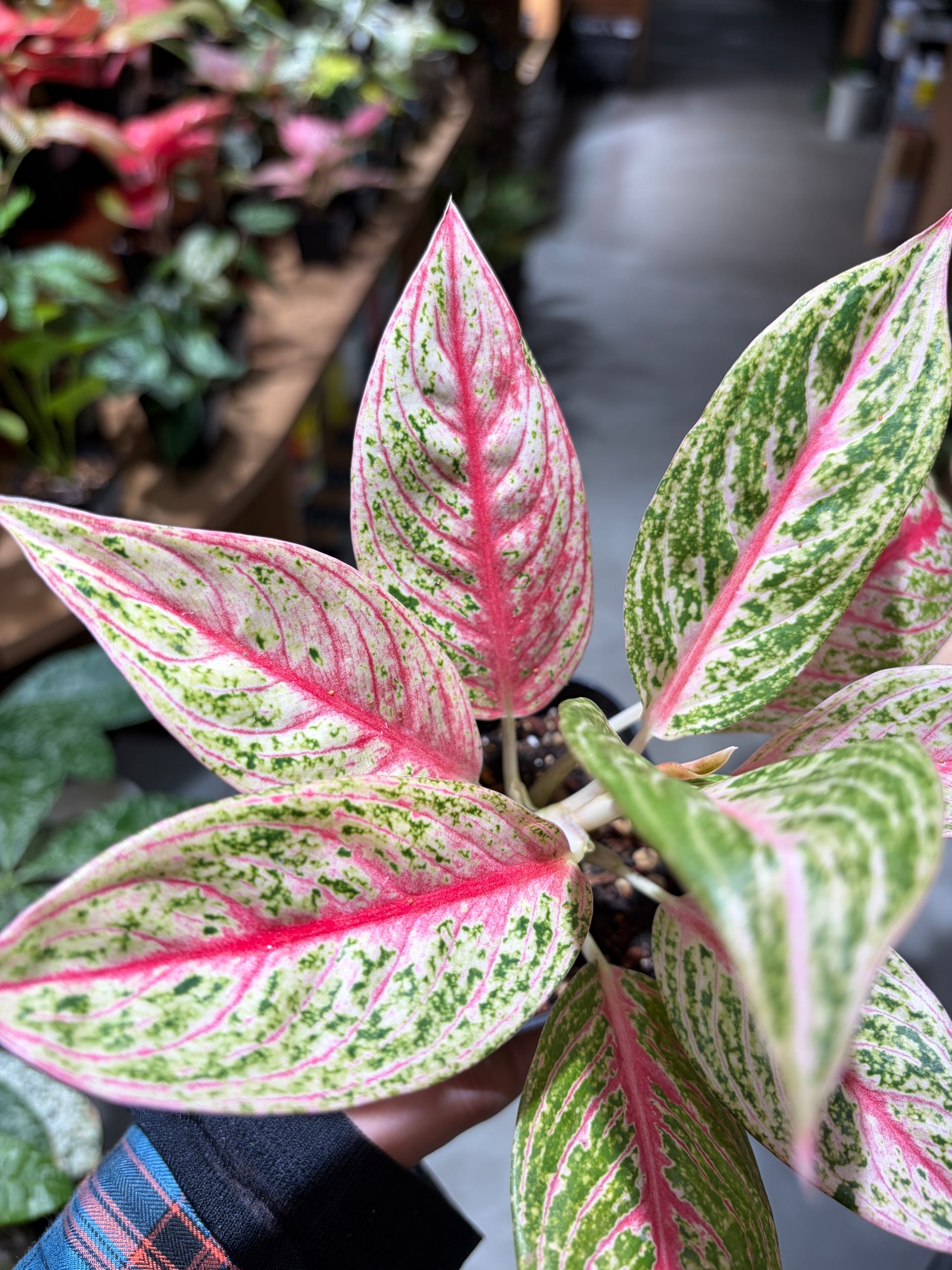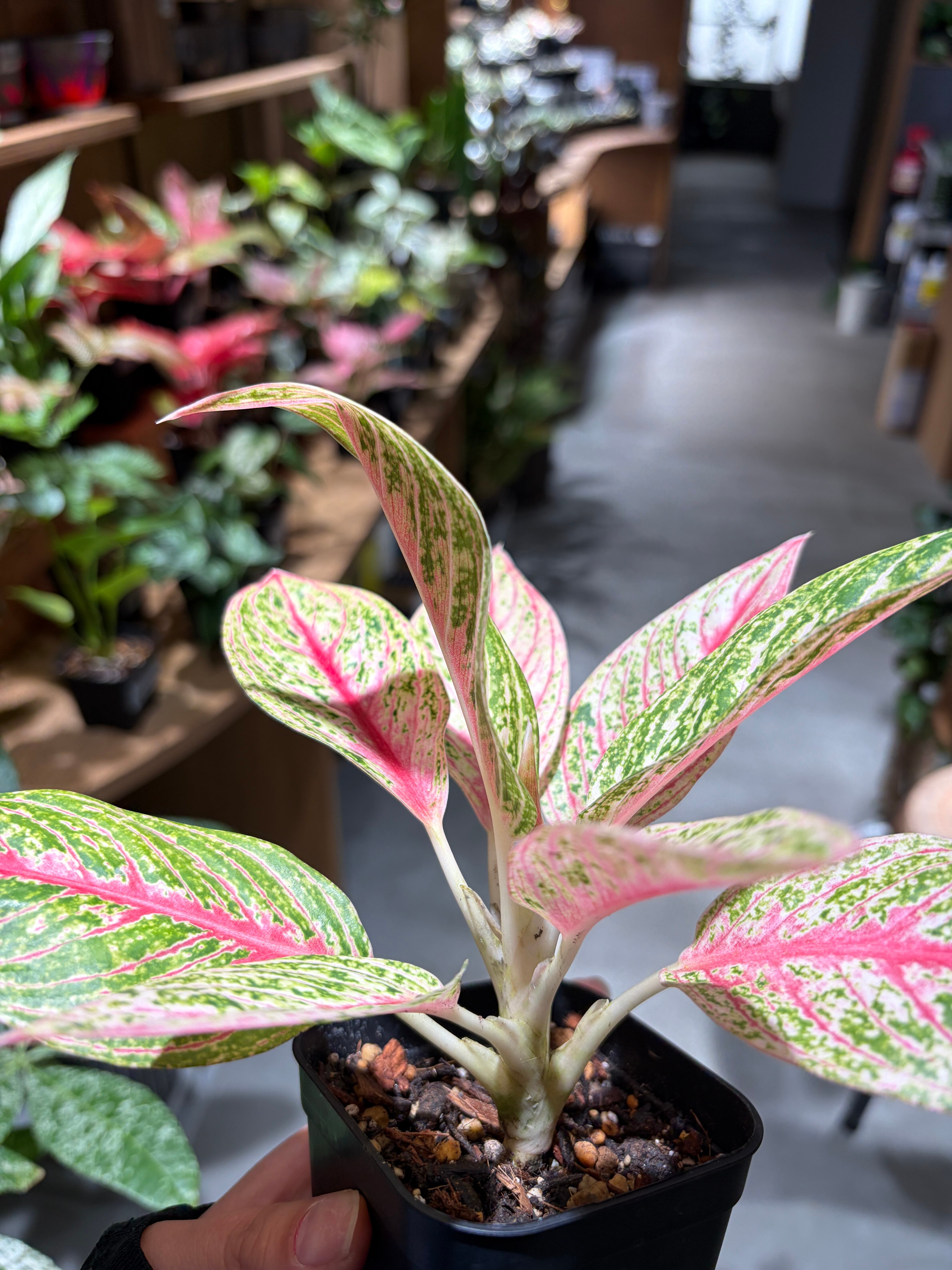 深いグリーンにピンクや赤の斑が入る美しい葉色が魅力で、