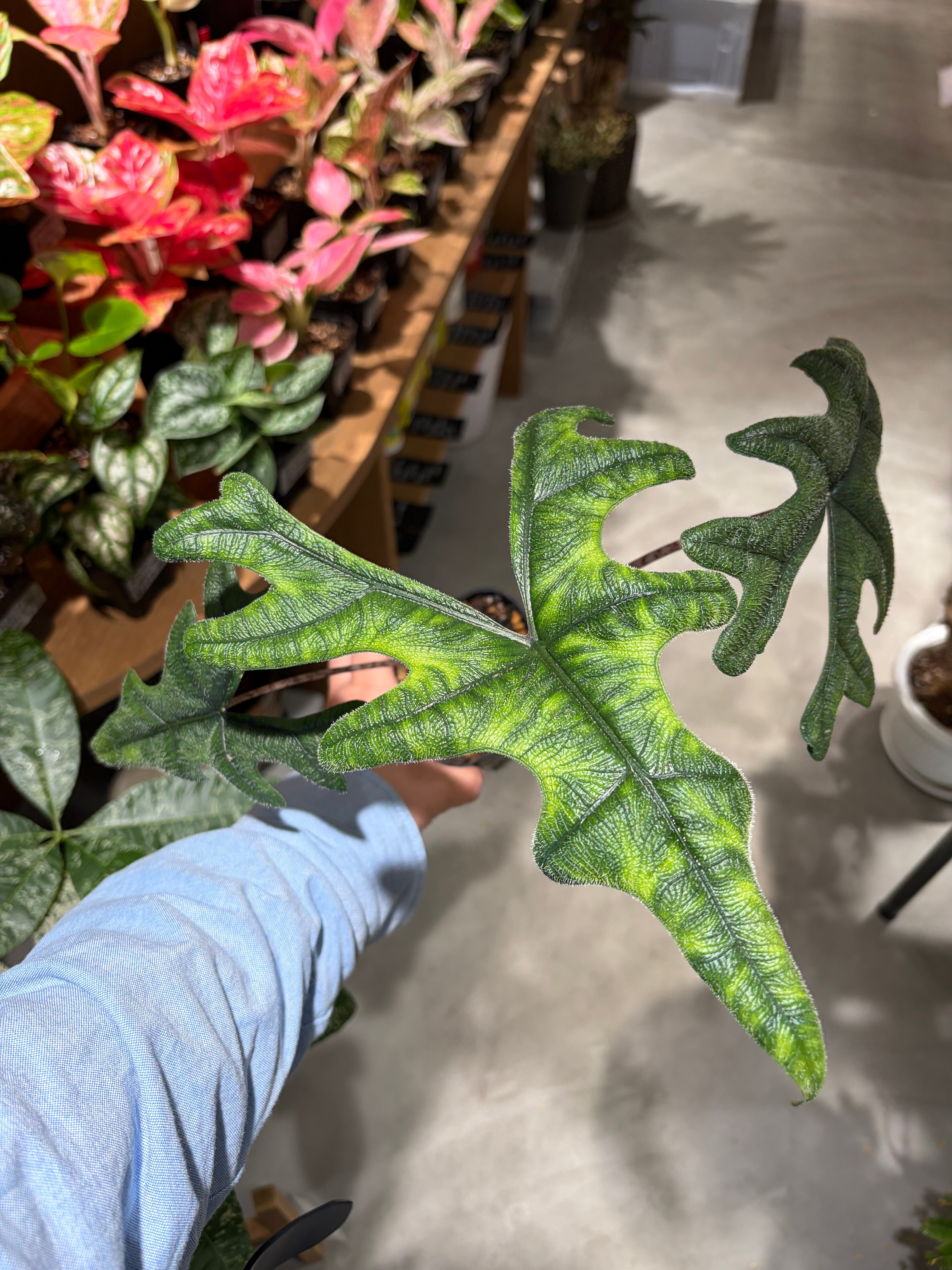 葉縁に刻まれた深い波状の切れ込みが、シャープな矢尻形の美しい輪郭を際立たせます。