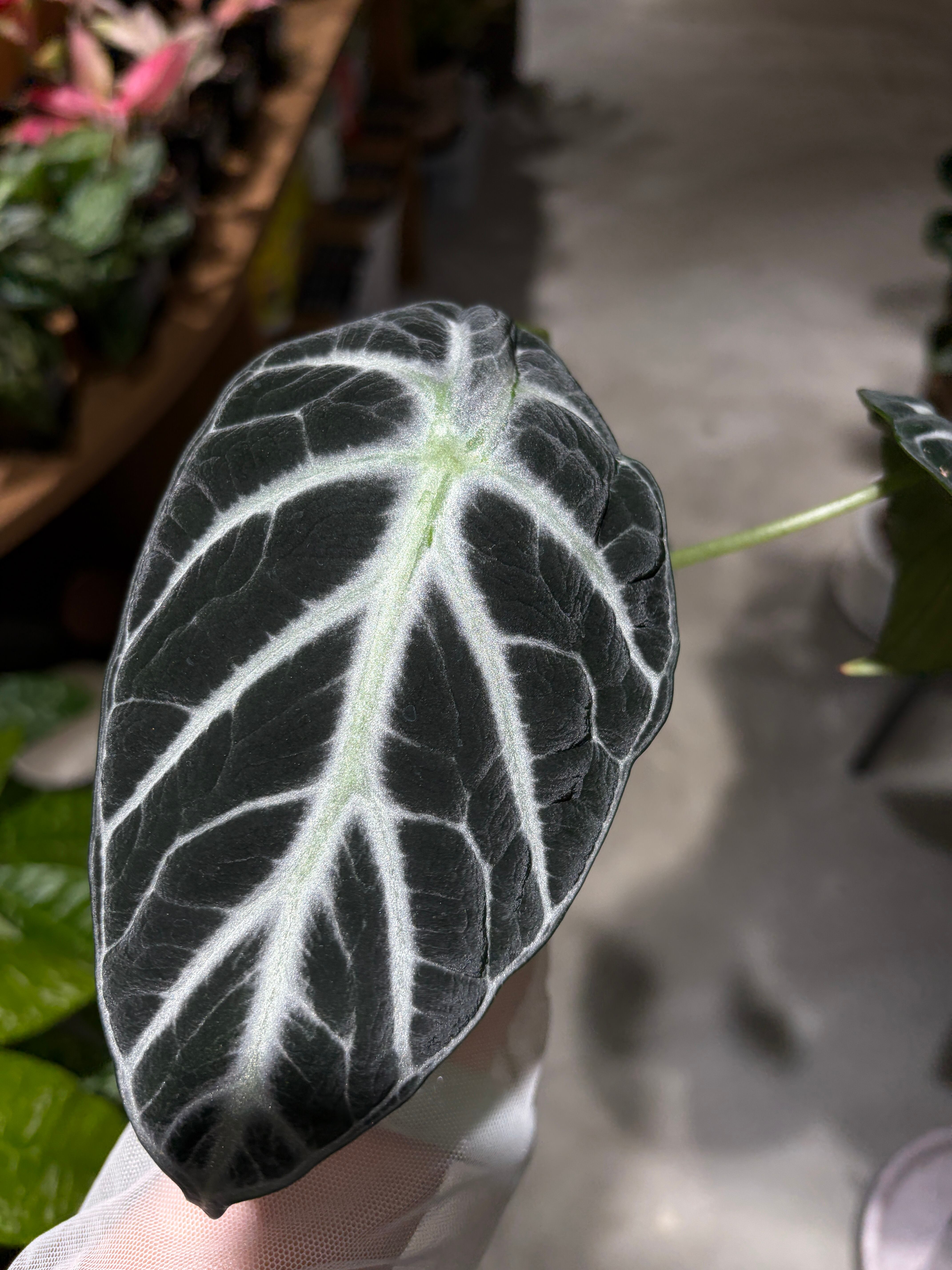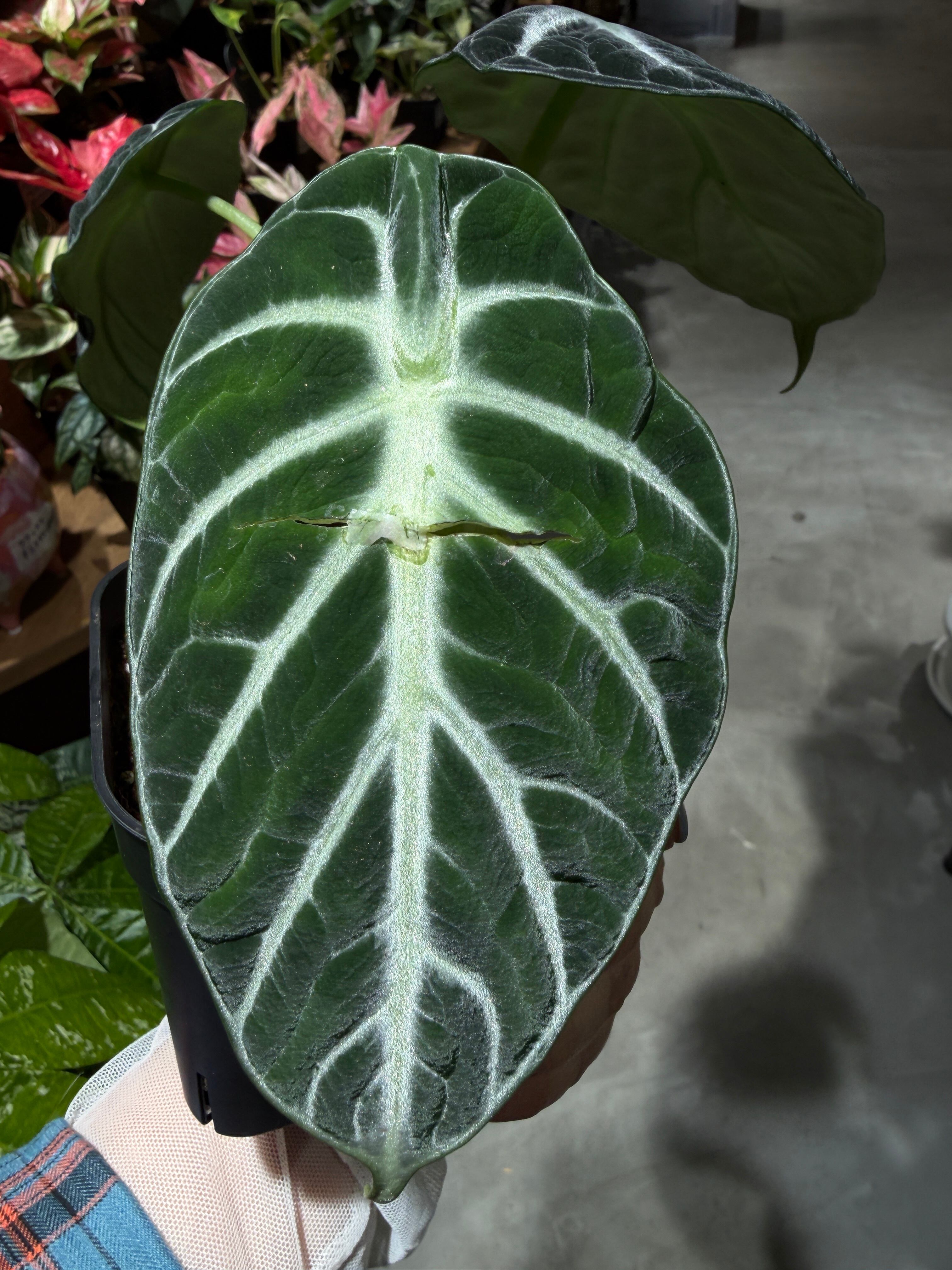 ベルベットのような質感の黒緑の葉に、白い葉脈が鮮やかに浮かぶ人気の観葉植物です。